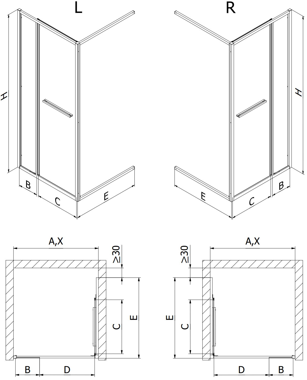 Dušo kabinos, durys ir sienelės yra standartiškai pritaikytos montuoti ant nustatytų matmenų dušo padėklų. Būtent šie matmenys nurodomi gaminio pavadinime arba aprašyme. Tačiau atkreipkite dėmesį, kad faktiniai elementų matmenys gali šiek tiek skirtis nuo vardinių verčių. Planuojant montuoti tiesiai ant grindų, rekomenduojama atidžiai patikrinti išorinius matmenis ir elementų išdėstymą pagal techninį brėžinį.