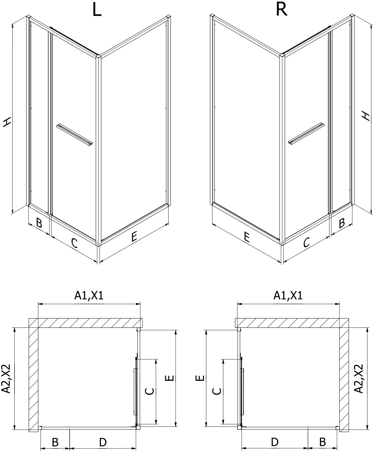 Dušo kabinos, durys ir sienelės yra standartiškai pritaikytos montuoti ant nustatytų matmenų dušo padėklų. Būtent šie matmenys nurodomi gaminio pavadinime arba aprašyme. Tačiau atkreipkite dėmesį, kad faktiniai elementų matmenys gali šiek tiek skirtis nuo vardinių verčių. Planuojant montuoti tiesiai ant grindų, rekomenduojama atidžiai patikrinti išorinius matmenis ir elementų išdėstymą pagal techninį brėžinį.