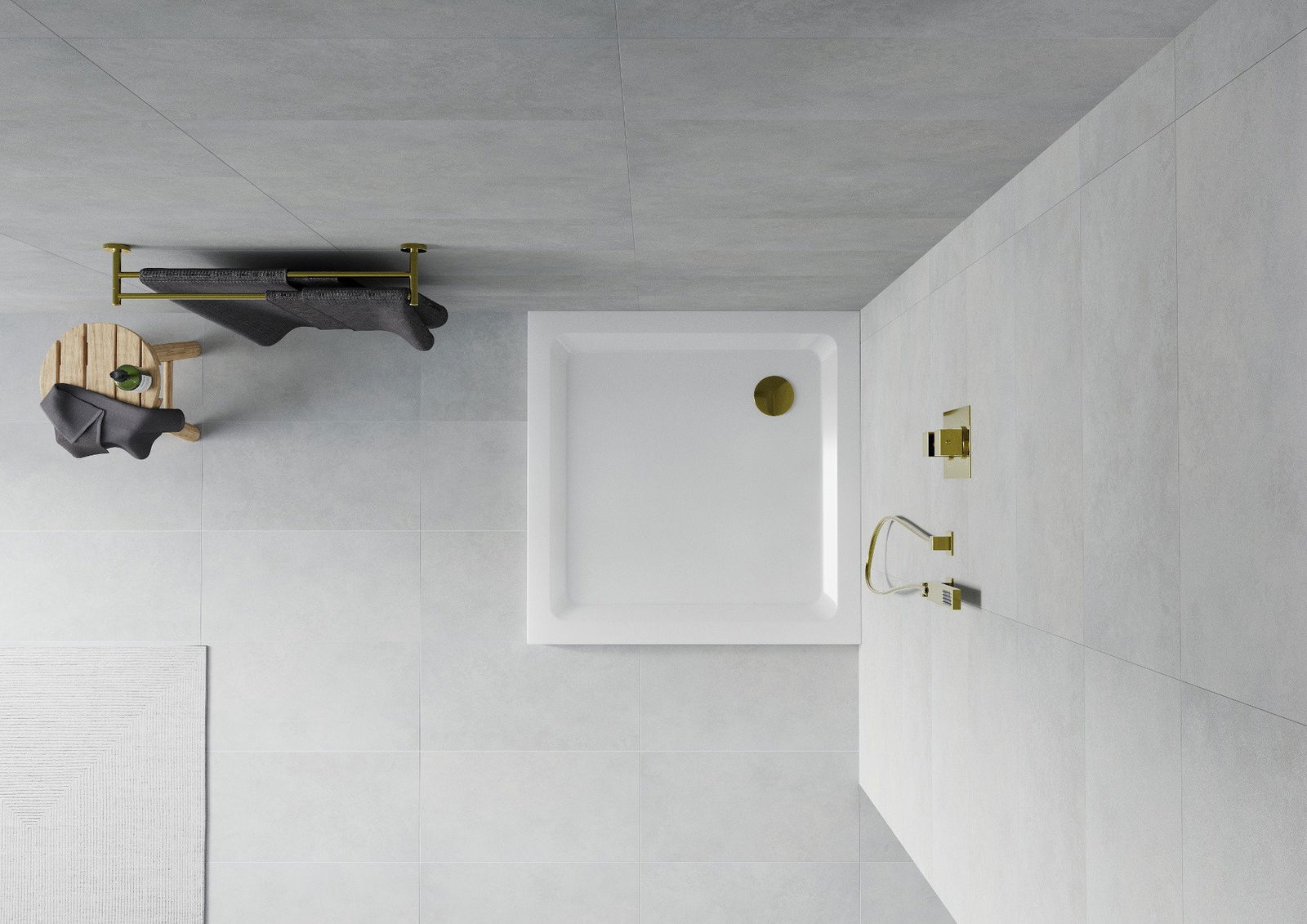 Mexen Flat kvadratinis plonas dušo padėklas 90 x 90 cm, baltas, auksinis sifonas - 40109090G