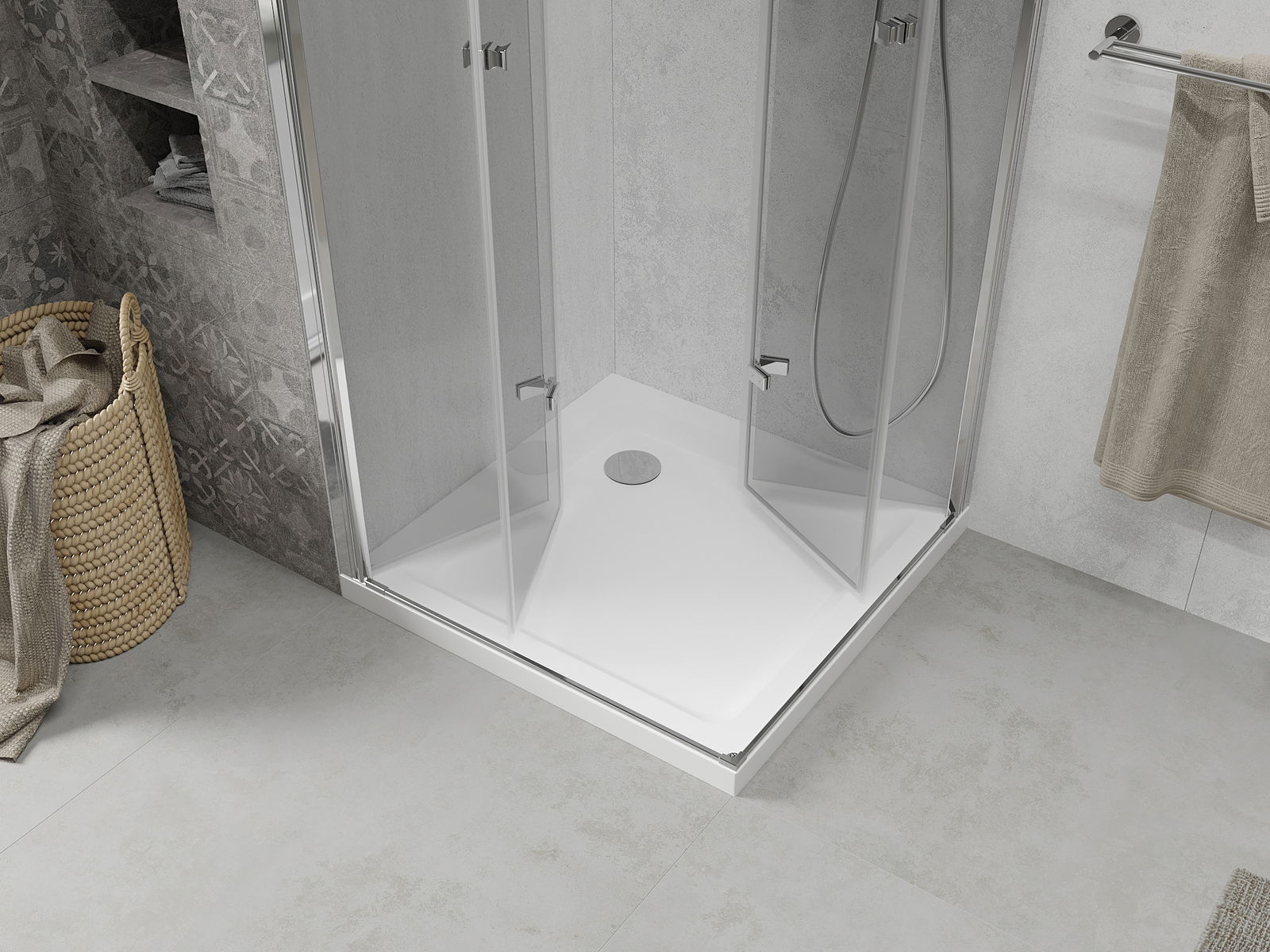 Galimybė sulenkti duris, tiek į išorę, tiek į vidų, leidžia gauti daugiau erdvės nenaudojant dušo. Tai yra idealus sprendimas mažesnėms vonios kambariams, maksimaliai išnaudojantis turimą plotą.