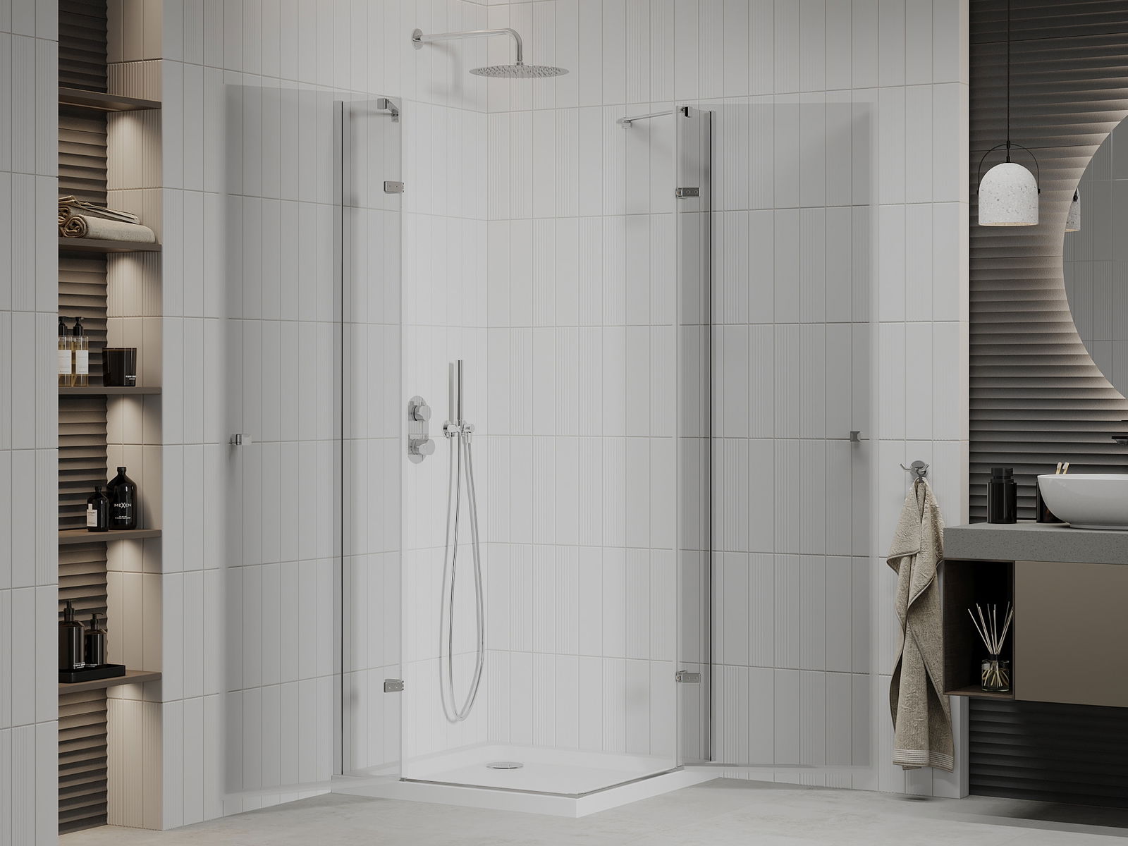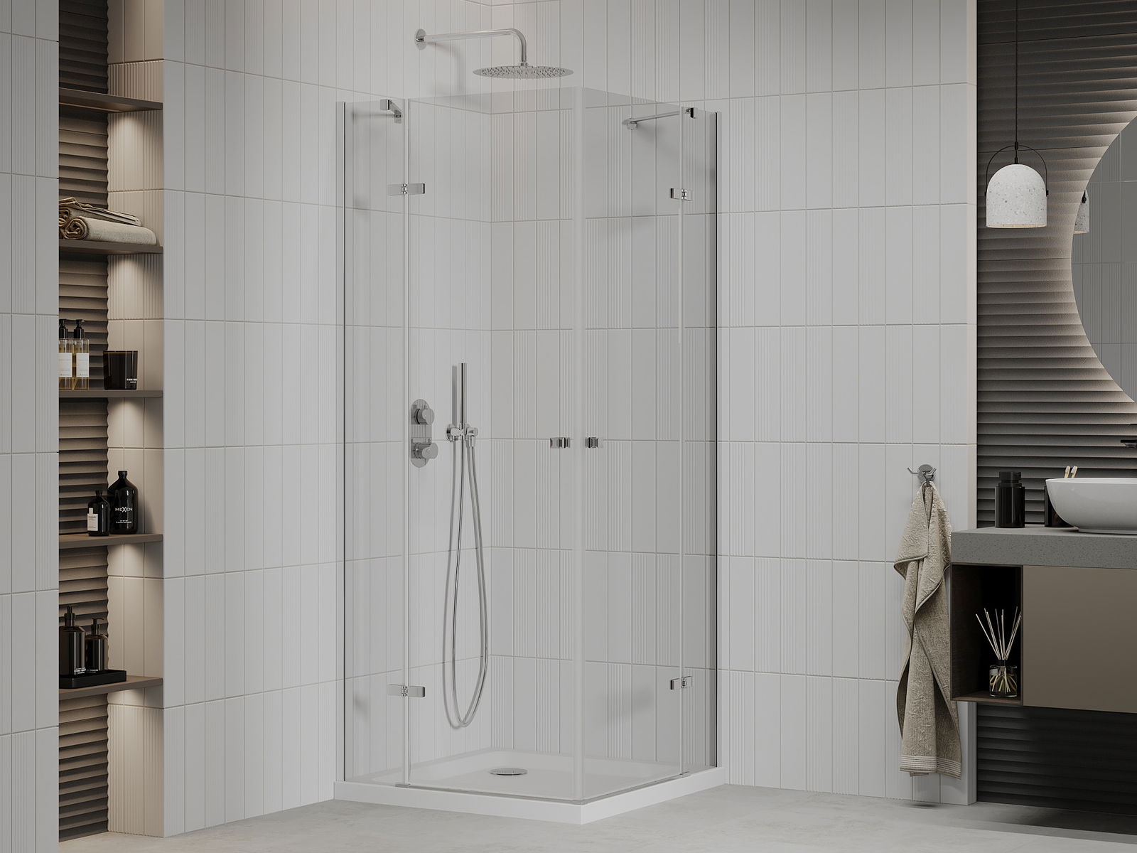 Mexen Roma Dviejų durų dušo kabina atverčiama 90 x 90 cm, skaidri, chromuota + plokščia dušo padėklas