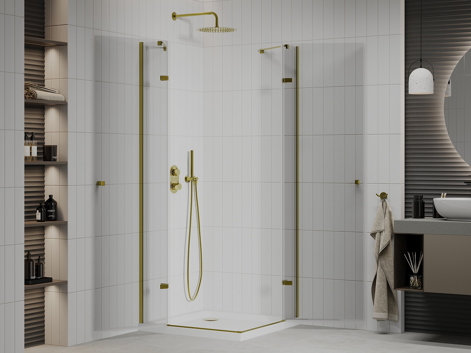 Mexen Roma Duo dušo kabina yra elegantiškas pasirinkimas modernioms vonios kambariams. Su dydžiu 90x90 cm ir aukščiu 190 cm, ji siūlo universalų montavimą ir patogias varstomas duris. Permatomas grūdintas stiklas, kurio storis 6 mm, apdailintas auksine spalva, o aliumininis profilis pabrėžia jo modernų dizainą. Kabina turi valymą palengvinančią dangą, galimybę reguliuoti plotį ir sienos nelygumų lyginimą, taip pat efektyvią vandens nukreipimo sistemą. Kartu su plokščiu padėklu iš balto sanitarinio akrilo, komplekte yra auksinis korkas ir sifonas, valomas iš viršaus, kas palengvina švaros palaikymą.