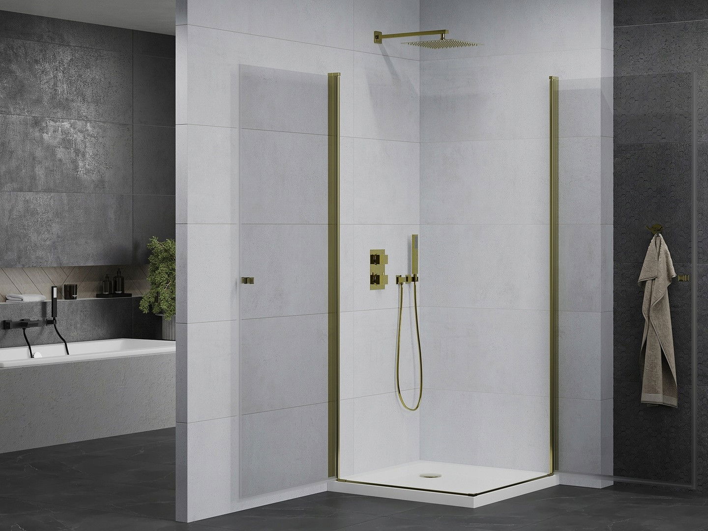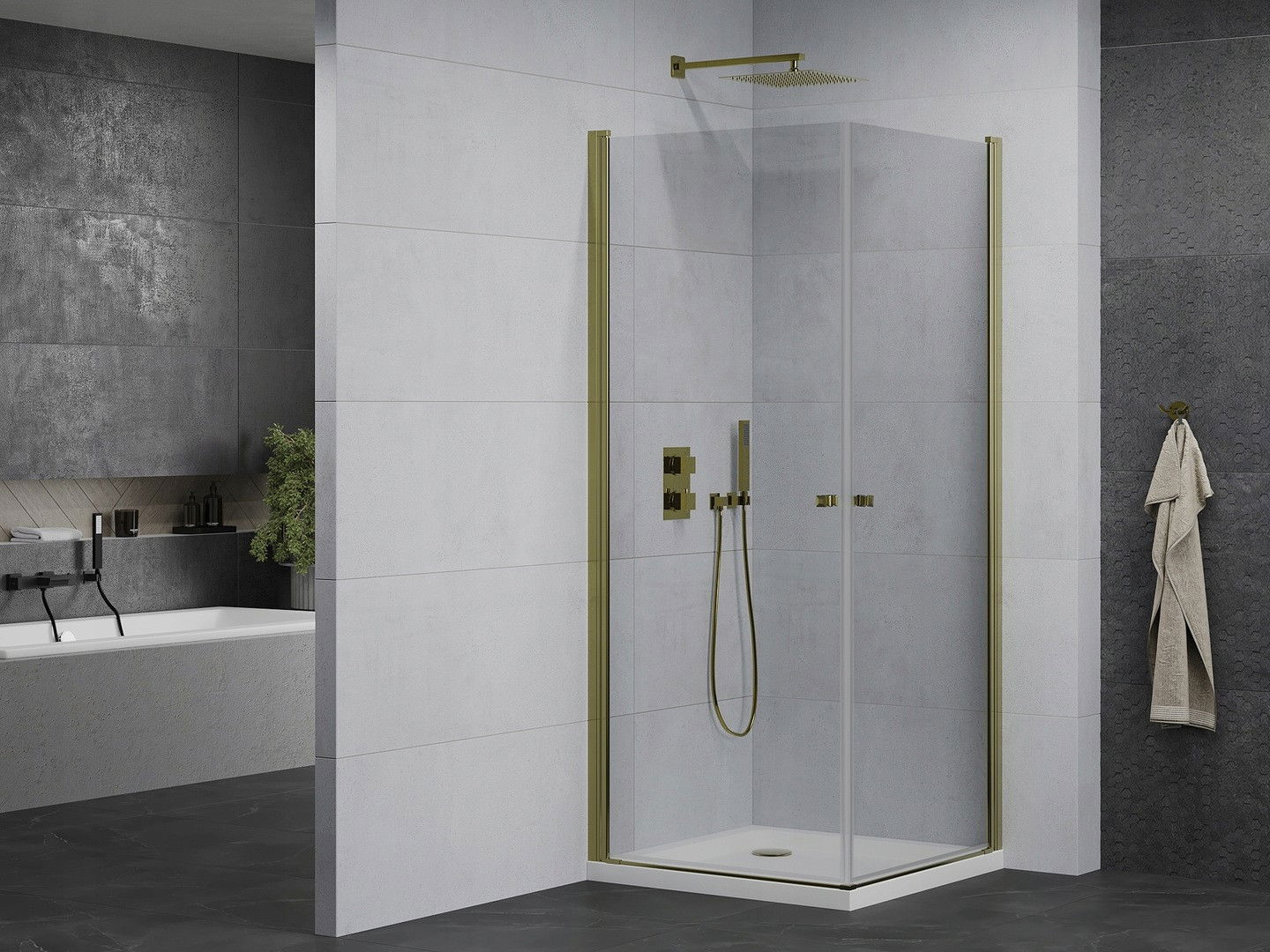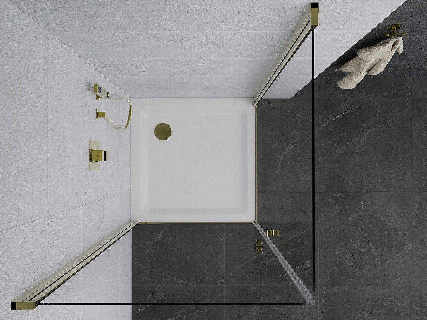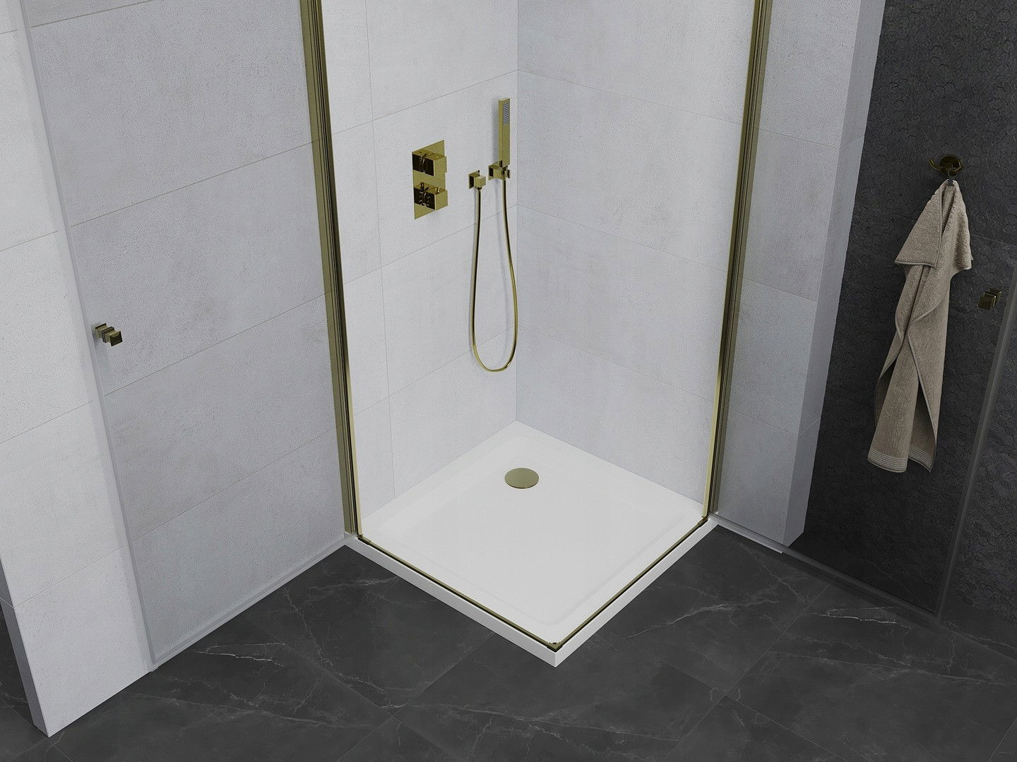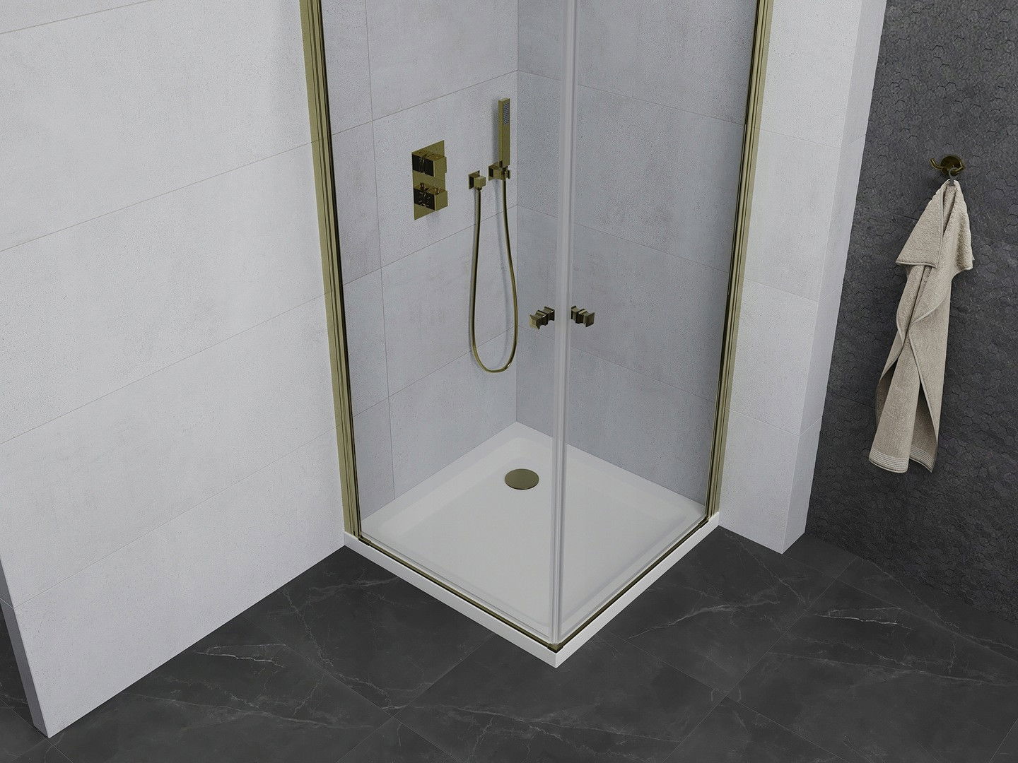 Mexen Pretoria Duo pakabinamas dušas 70 x 70 cm, permatomas, auksinis + padėklas Flat - 852-070-070-50-02-4010G