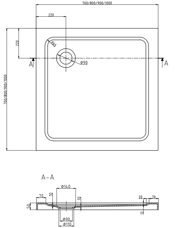 Dušo padėklo techniniai duomenys: