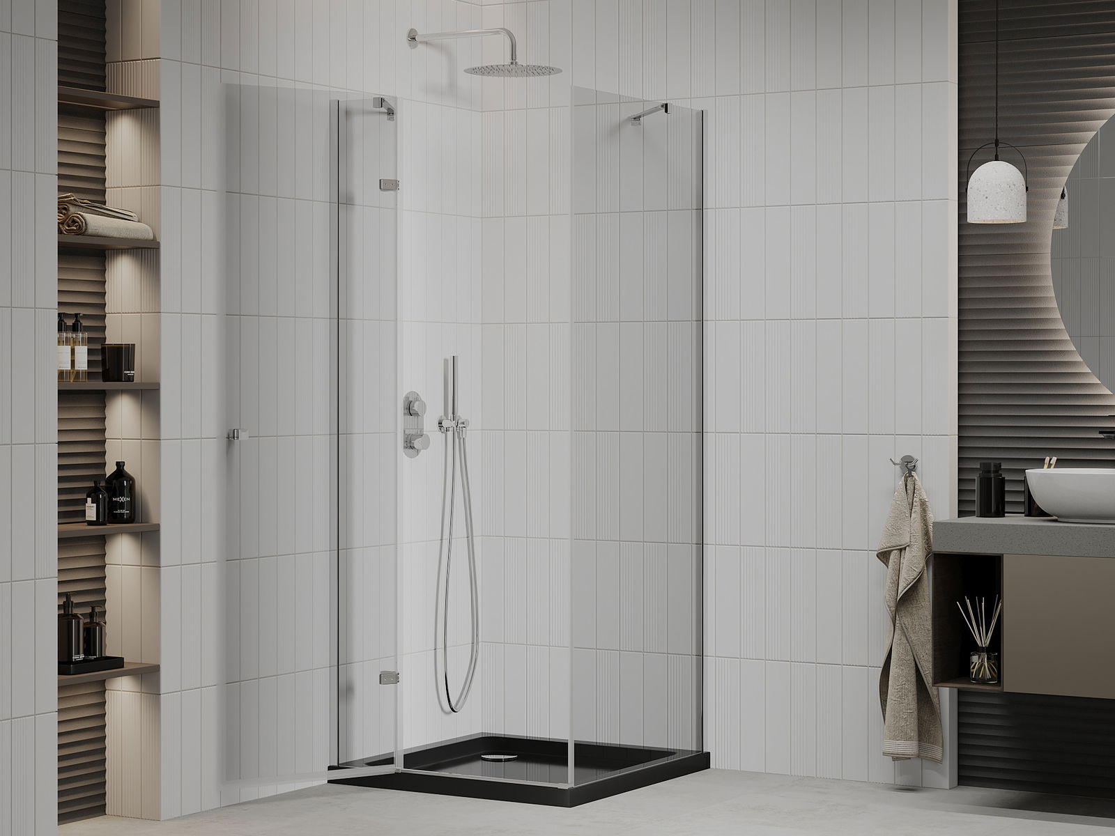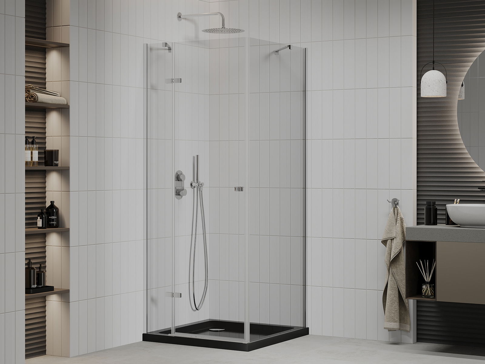 Mexen Roma dušo kabina atveriama 90 x 90 cm, skaidri, chromuota + plokščias padėklas, juodas - 854-090-090-01-00-4070