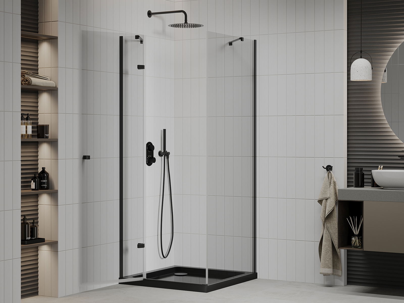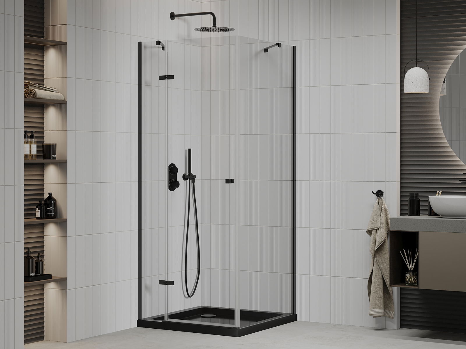 Mexen Roma dušo kabina varstoma 90 x 90 cm, permatoma, juoda + Flat dušo padėklas, juodas - 854-090-090-70-00-4070B