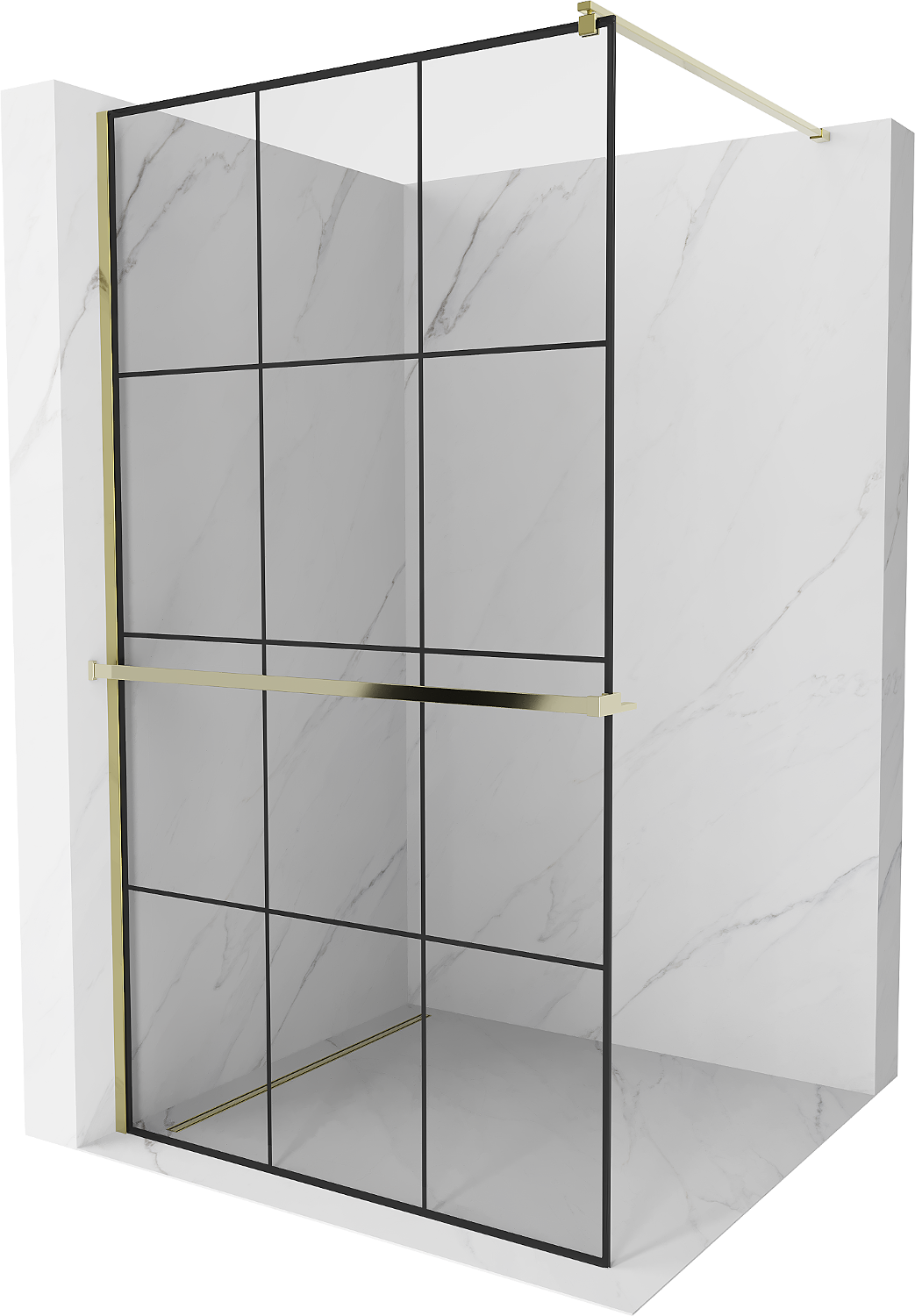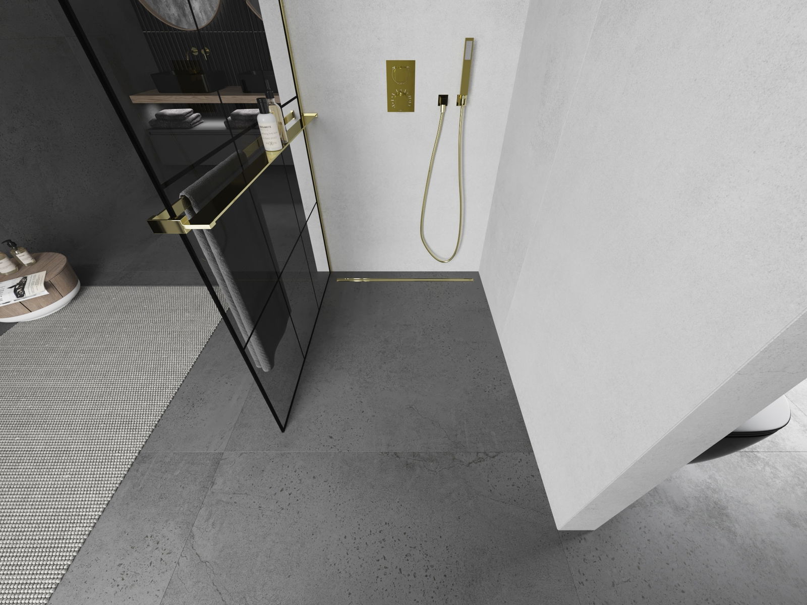 Mexen Kioto+ dušo sienelė su lentyna Walk-in 110 x 200 cm, juodas tinklelis, auksinė - 800-110-121-50-77