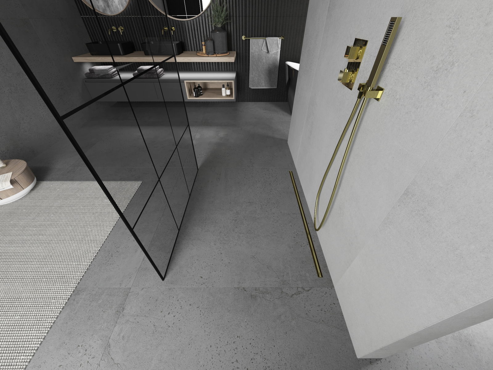 Mexen Kioto laisvai pastatoma dušo sienelė 120 x 200 cm, juodas tinklelis 8 mm, auksinė - 800-120-002-50-77
