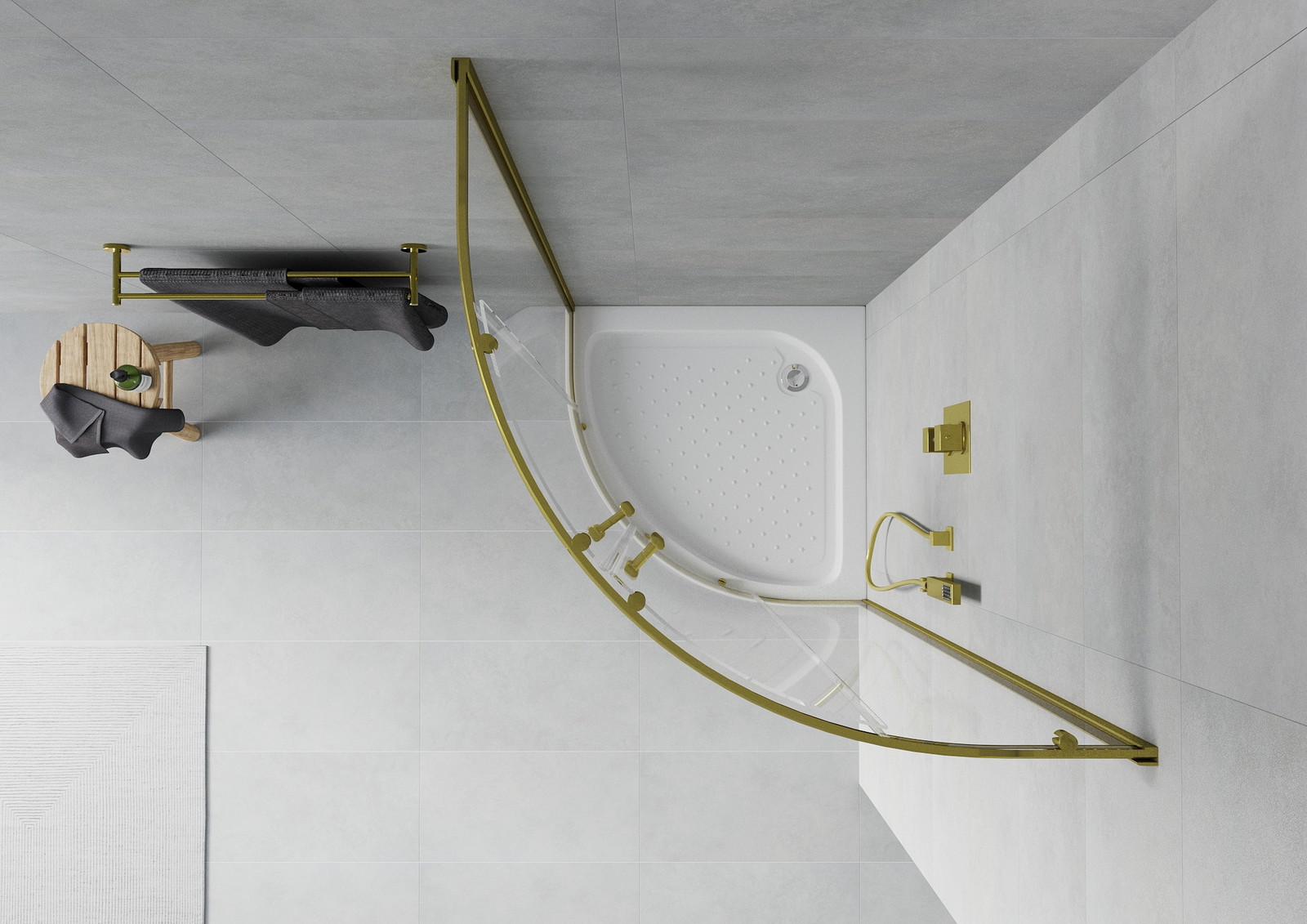 Mexen Rio yra elegantiška pusapvalė dušo kabina, kurios matmenys yra 80x80 cm, išsiskirianti auksine apdaila ir 6 mm storio permatomu grūdintu stiklu. Pritaikyta danga, palengvinanti valymą, ir sienų nelygumų korekcija. Kabina turi universalų montavimą ir stumdomas duris, todėl yra praktiška ir stilinga. Pridedama balta Rio dušo padėklas, pagaminta iš sanitarinio akrilo, matmenys 80x80x14 cm, su pločio reguliavimu ir sustiprintu pagrindu, užtikrinančiu patvarumą.