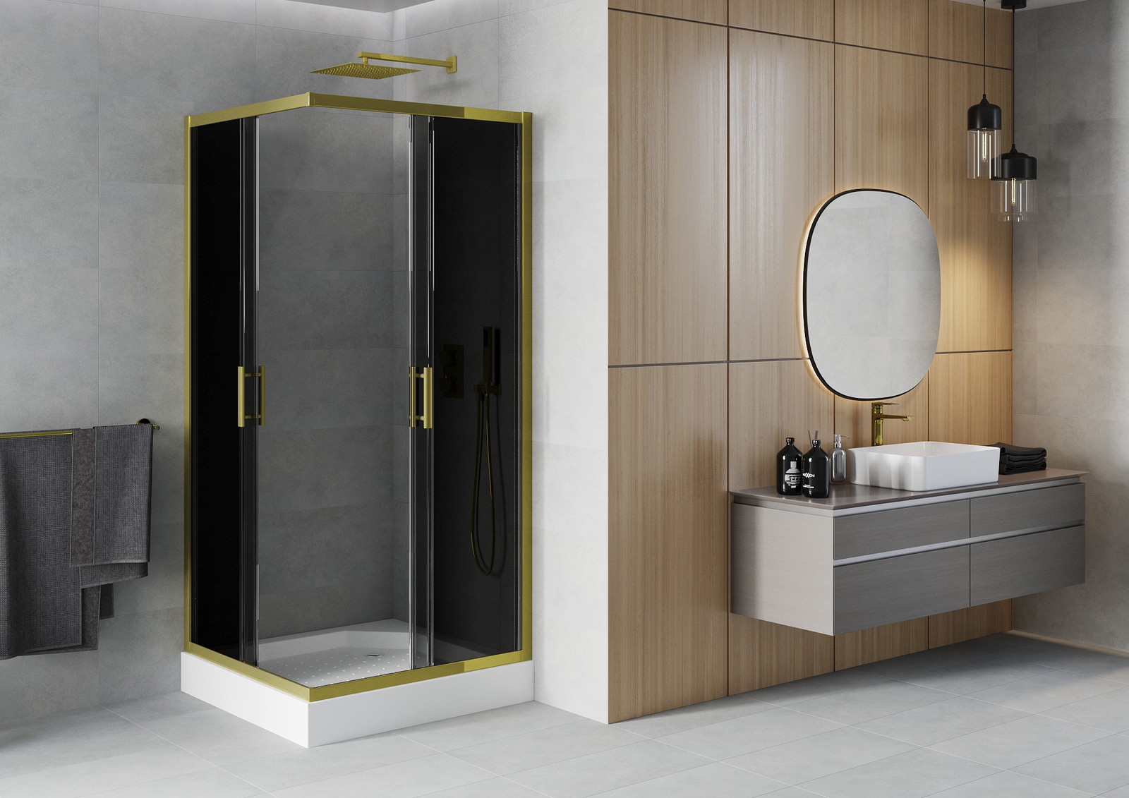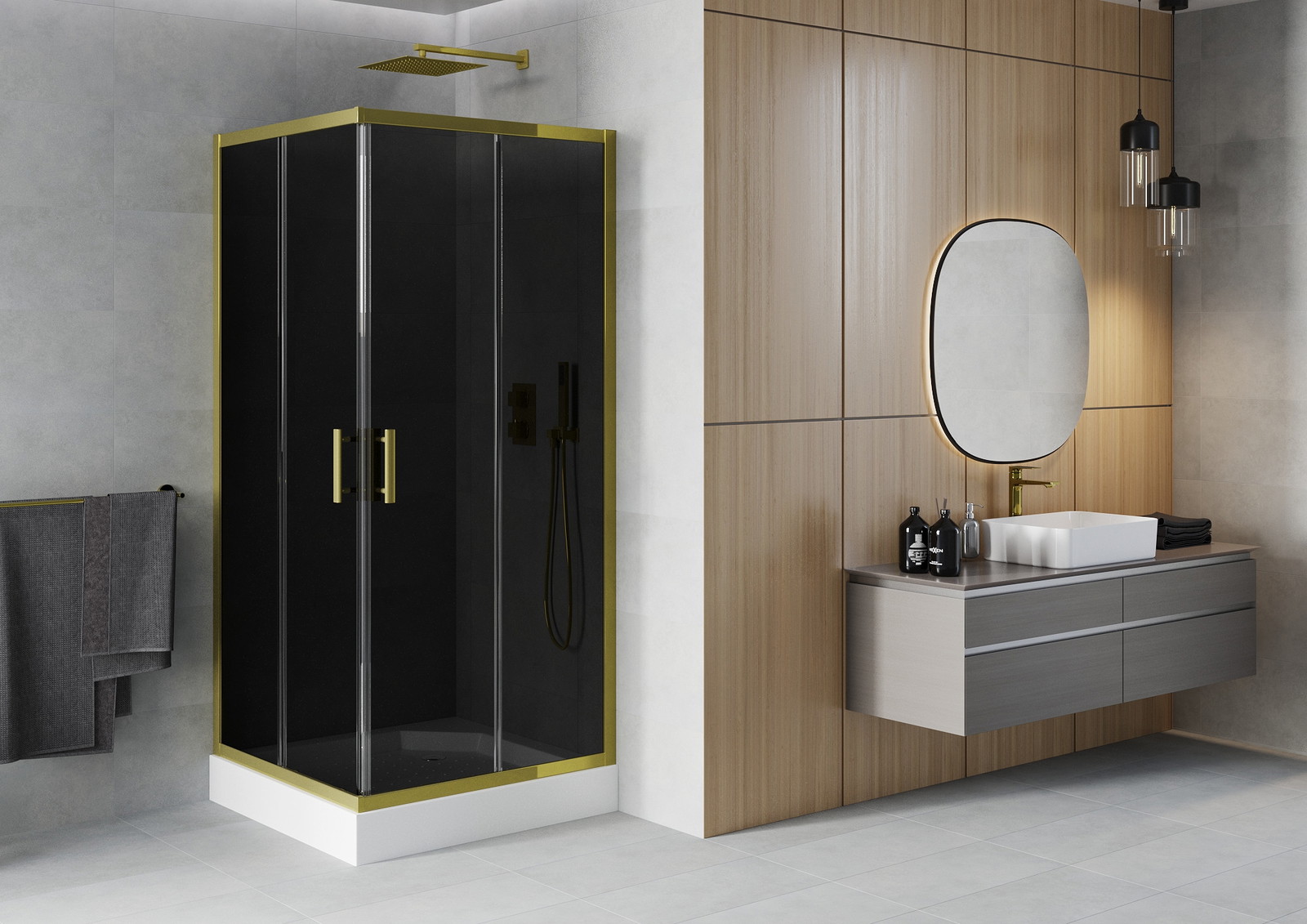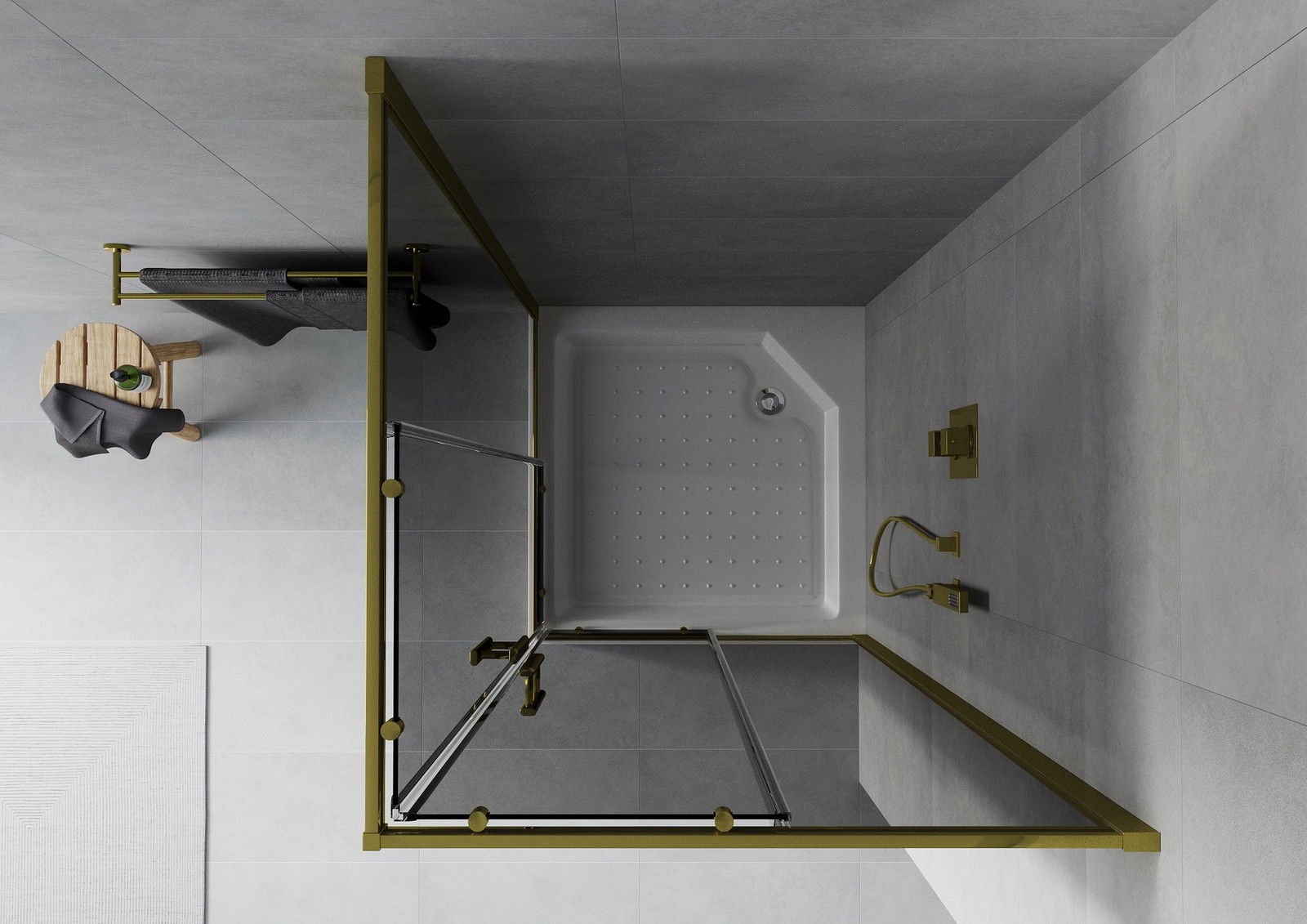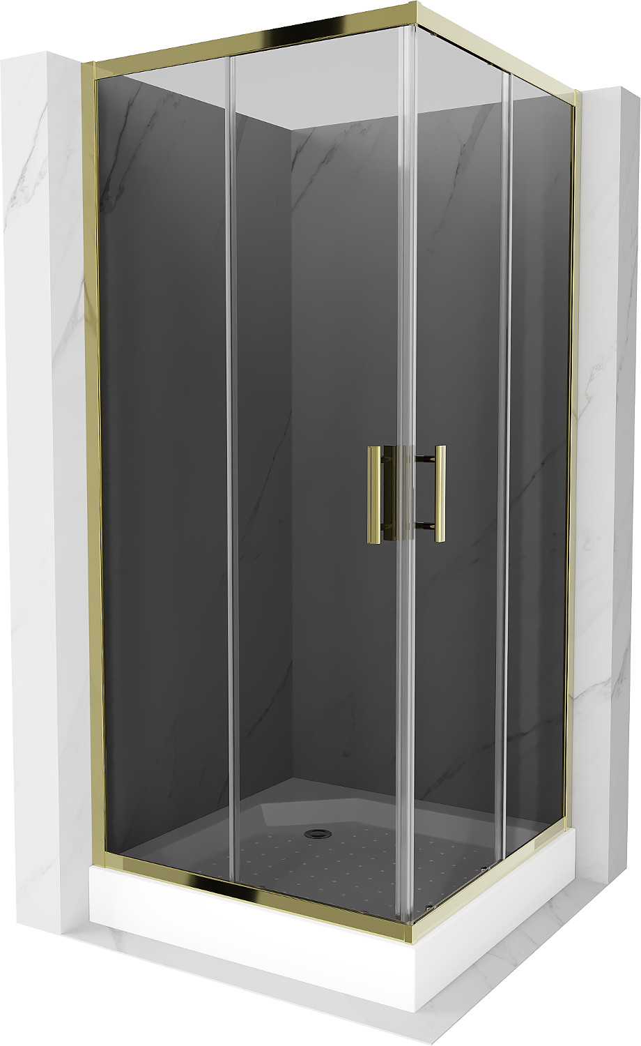 Mexen Rio kvadratinė dušo kabina 90 x 90 cm, grafitas, auksinė + padėklas, baltas - 860-090-090-50-40-4510