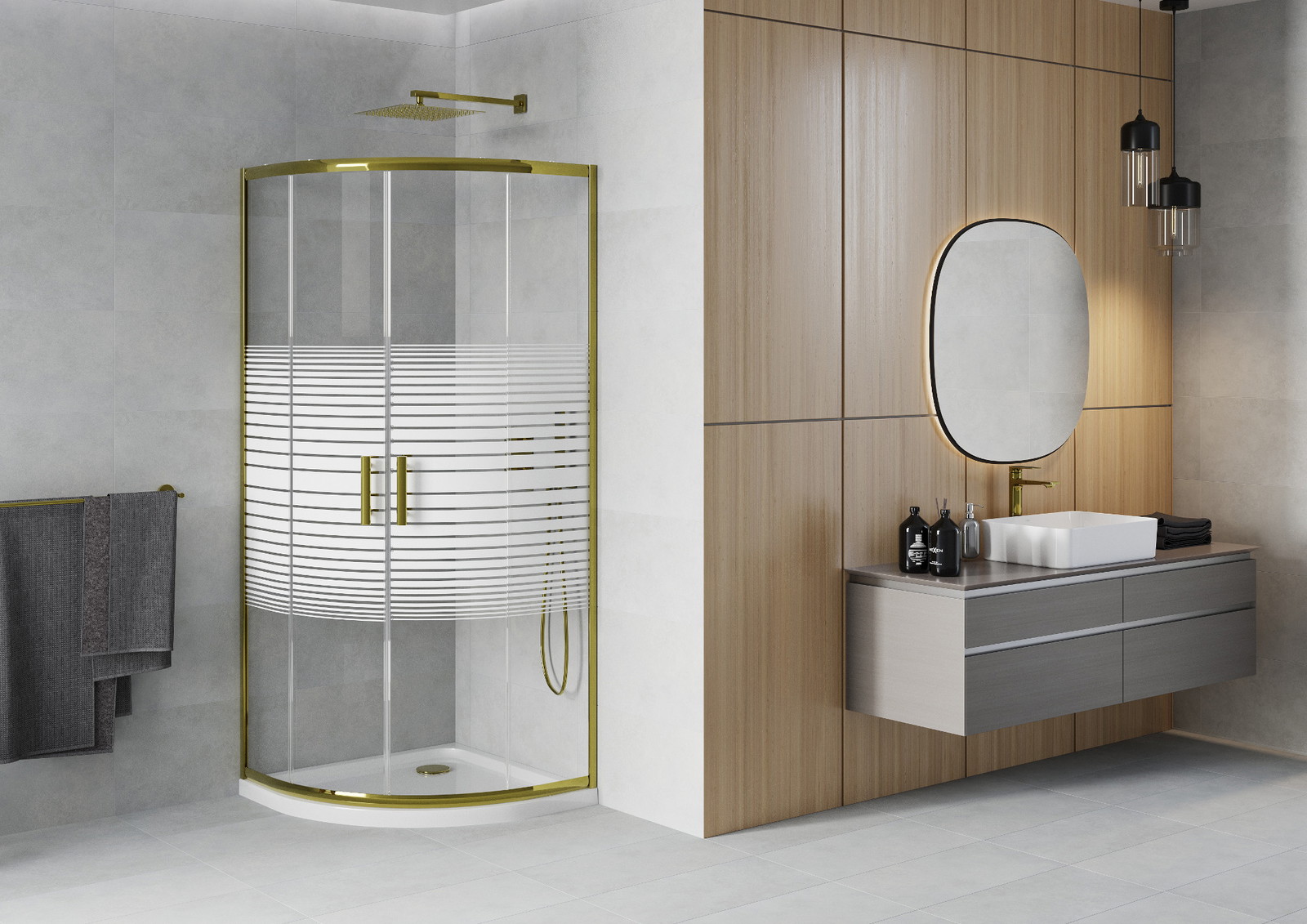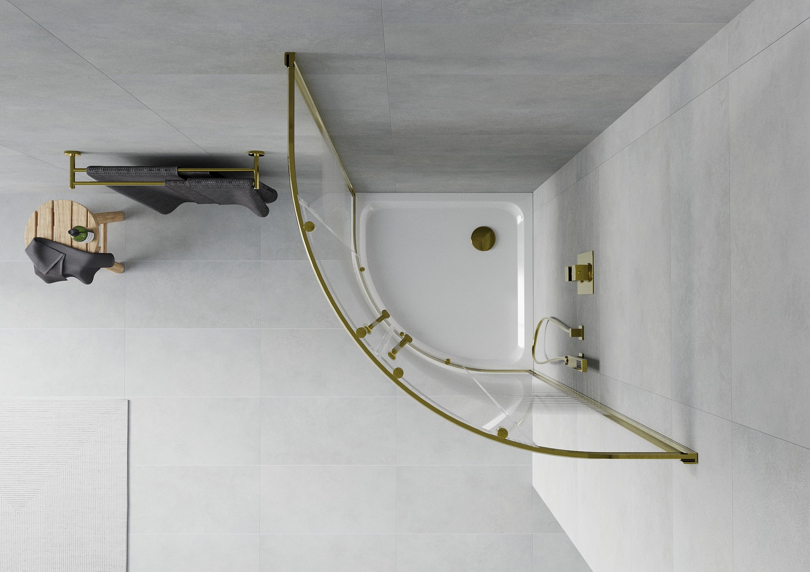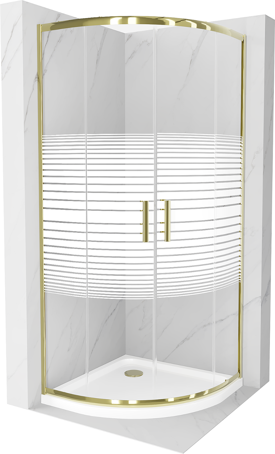 Mexen Rio pusapvalė dušo kabina 80 x 80 cm, baltos juostos, auksinė + Flat padėklas, baltas - 863-080-080-50-20-4110G