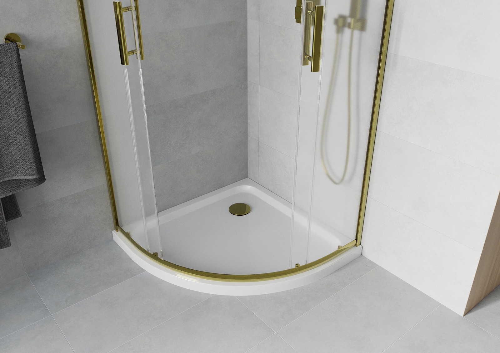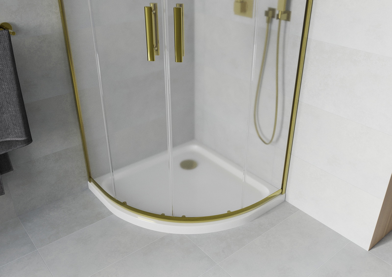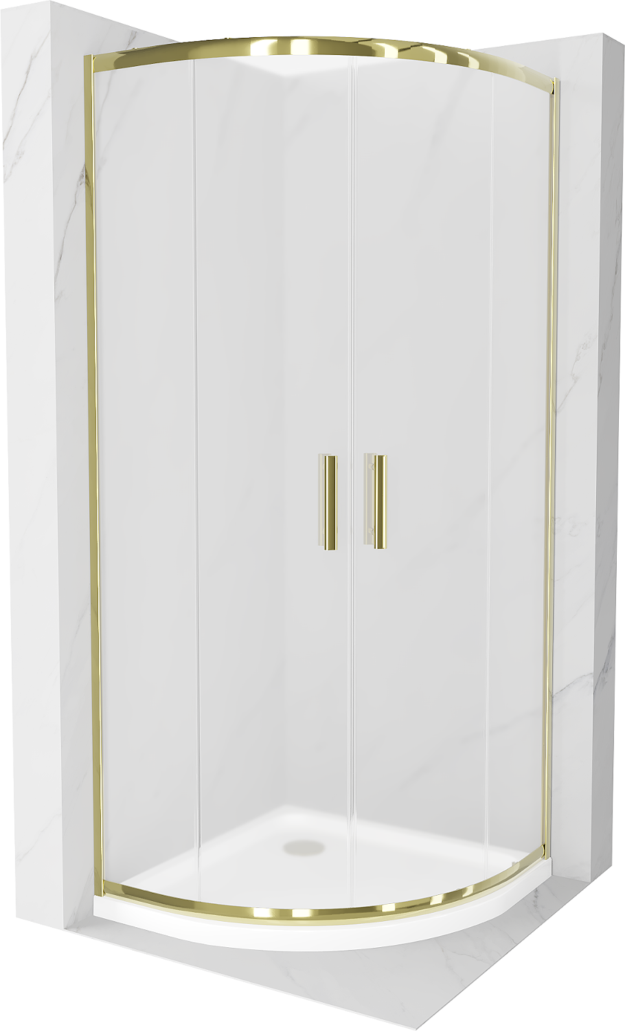 Mexen Rio yra elegantiška pusapvalė dušo kabina 90 x 90 cm su auksine apdaila ir matinio stiklo. Stumdomos durys ir universalus montavimas leidžia kabinai derėti prie įvairių vonios kambarių. 6 mm storio grūdintas stiklas ir aliuminio profiliai užtikrina ilgaamžiškumą ir saugumą, o speciali danga palengvina valymą. Prie kabinos pridedamas baltas Flat akrilinis padėklas su sustiprintu dugnu, iš viršaus valomas sifonas ir auksinė kamštis suteikia prestižo ir funkcionalumo.