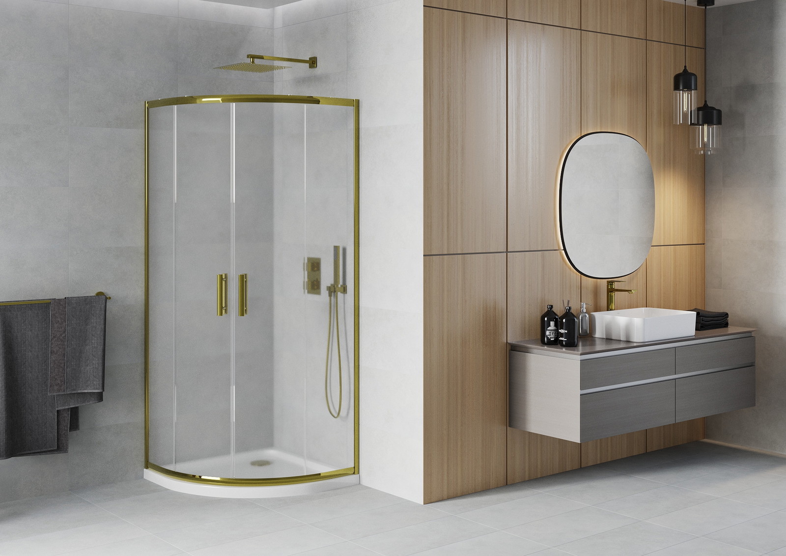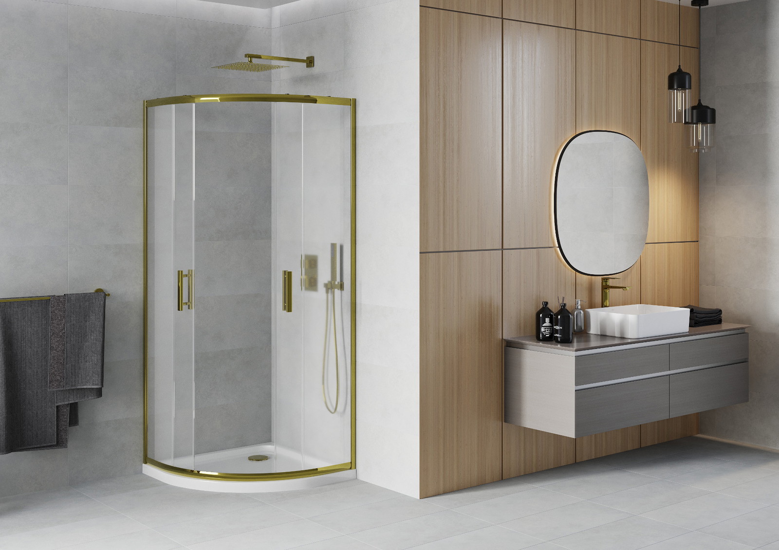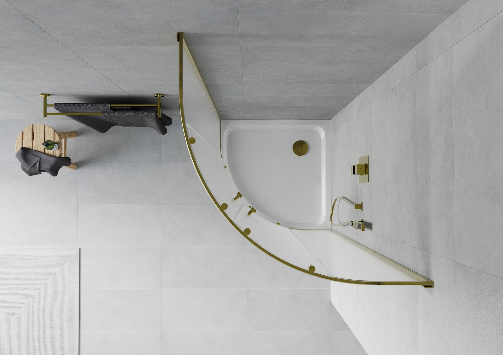 Mexen Rio yra elegantiška pusapvalė dušo kabina 90 x 90 cm su auksine apdaila ir matinio stiklo. Stumdomos durys ir universalus montavimas leidžia kabinai derėti prie įvairių vonios kambarių. 6 mm storio grūdintas stiklas ir aliuminio profiliai užtikrina ilgaamžiškumą ir saugumą, o speciali danga palengvina valymą. Prie kabinos pridedamas baltas Flat akrilinis padėklas su sustiprintu dugnu, iš viršaus valomas sifonas ir auksinė kamštis suteikia prestižo ir funkcionalumo.