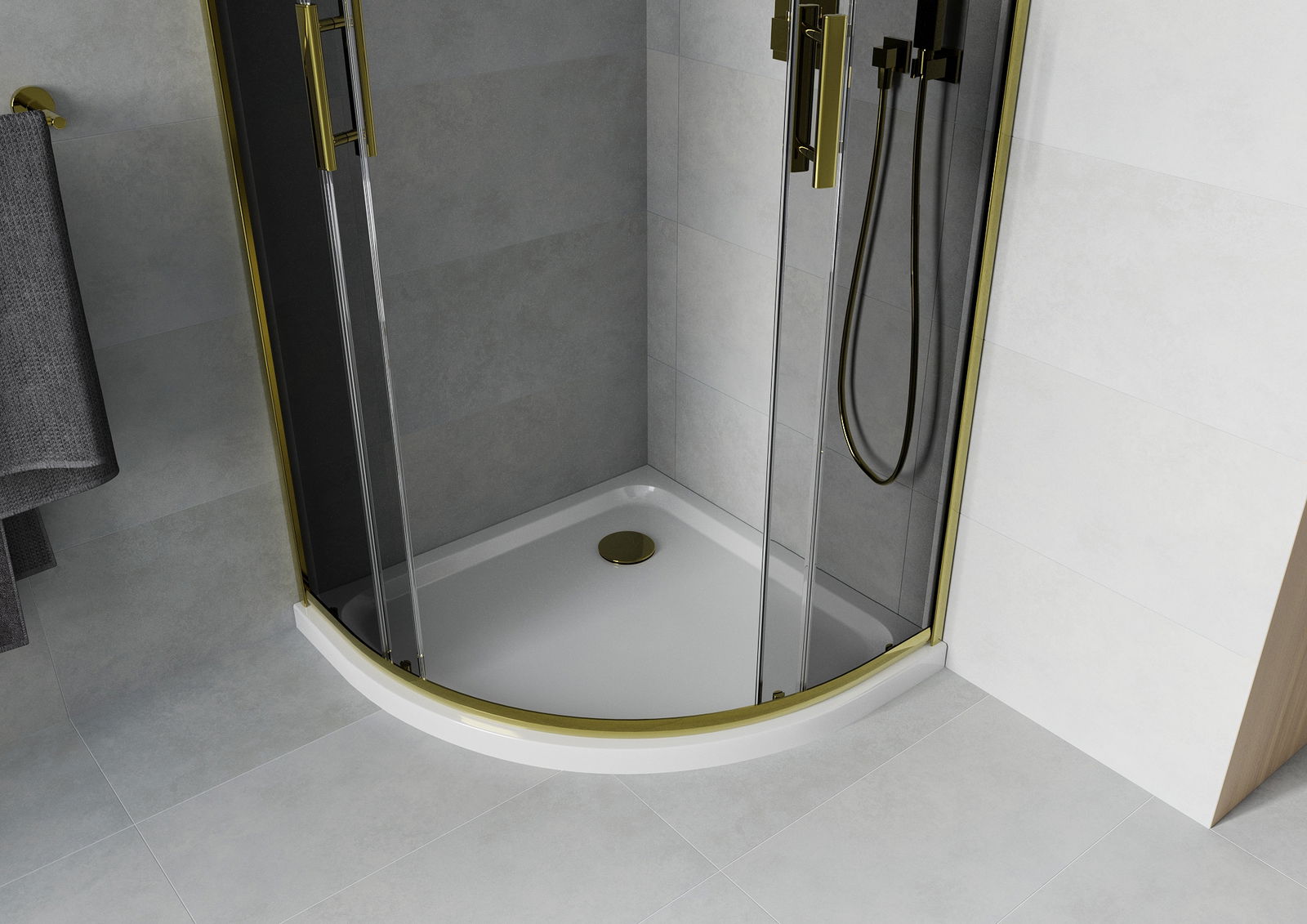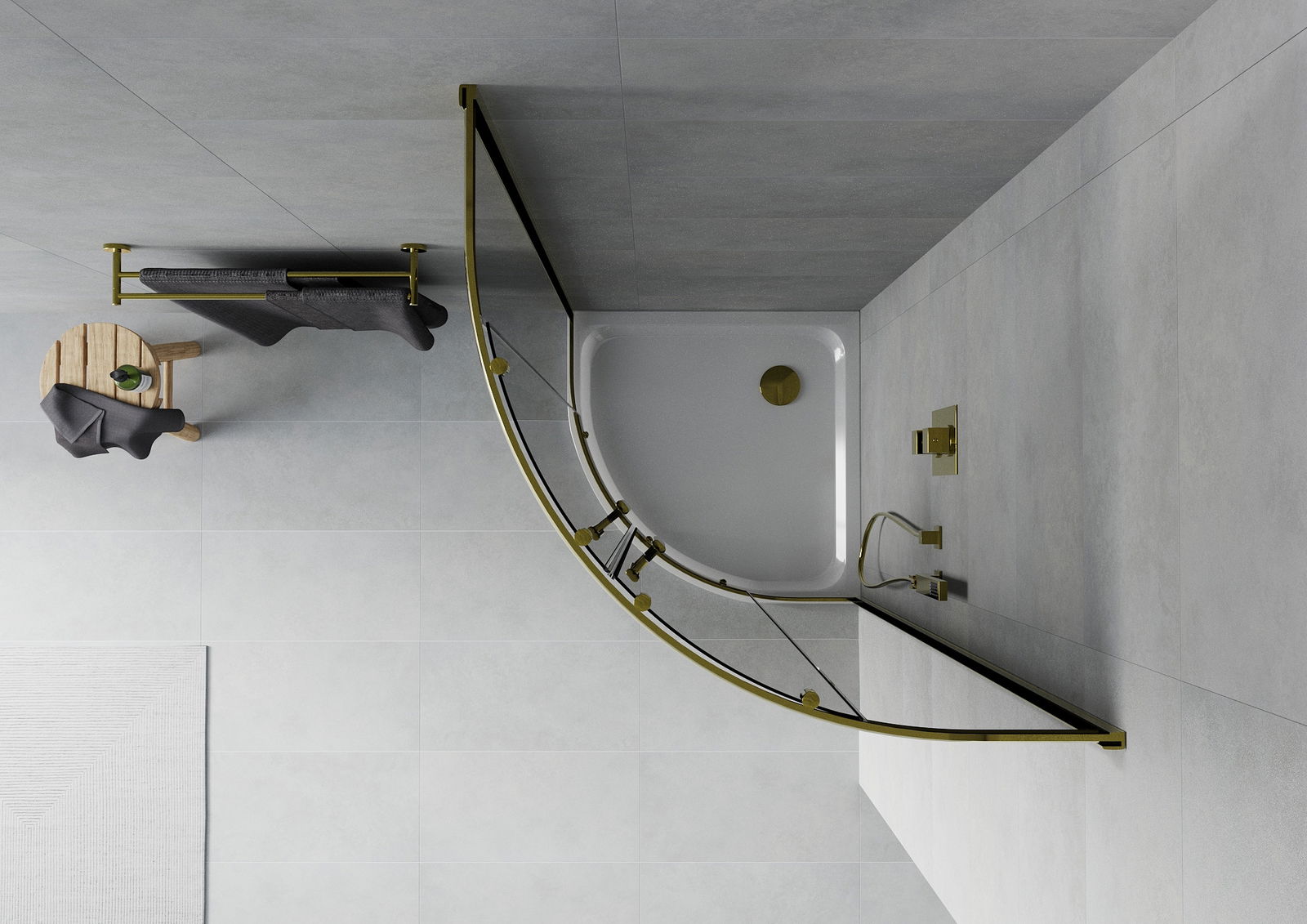 Mexen Rio pusapvalė dušo kabina 90 x 90 cm, grafitas, auksinė + Flat padėklas, baltas - 863-090-090-50-40-4110G