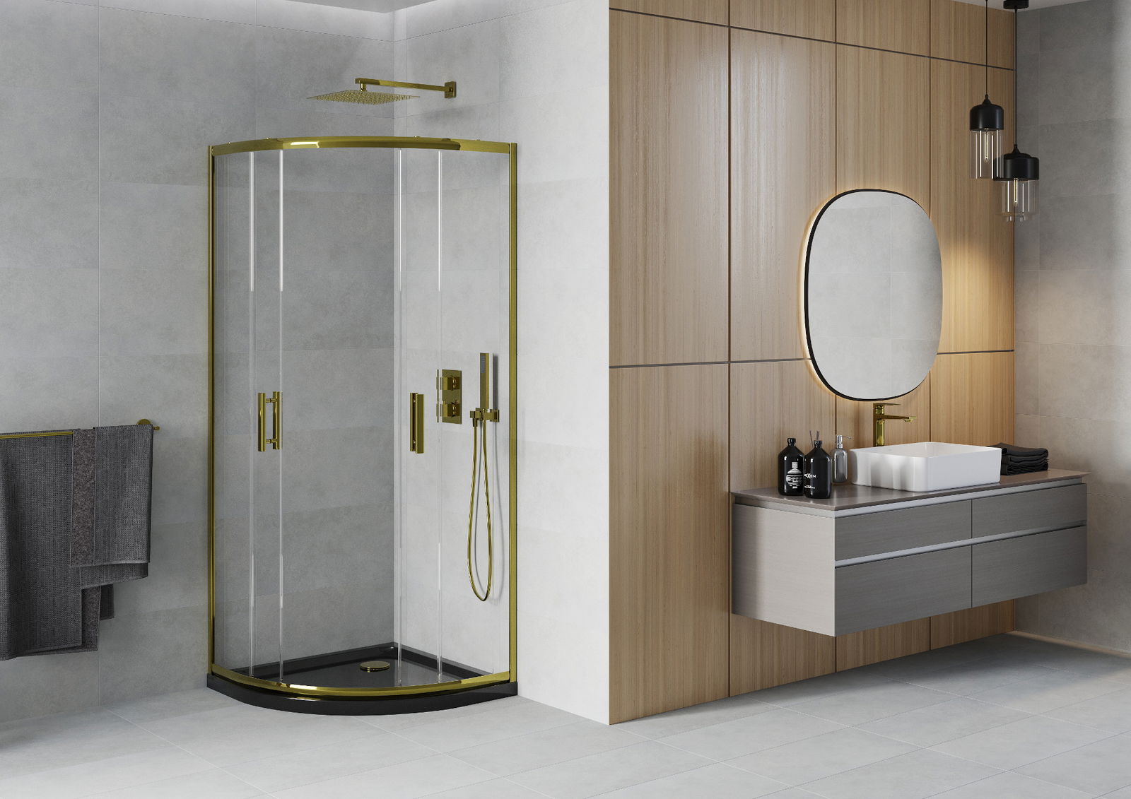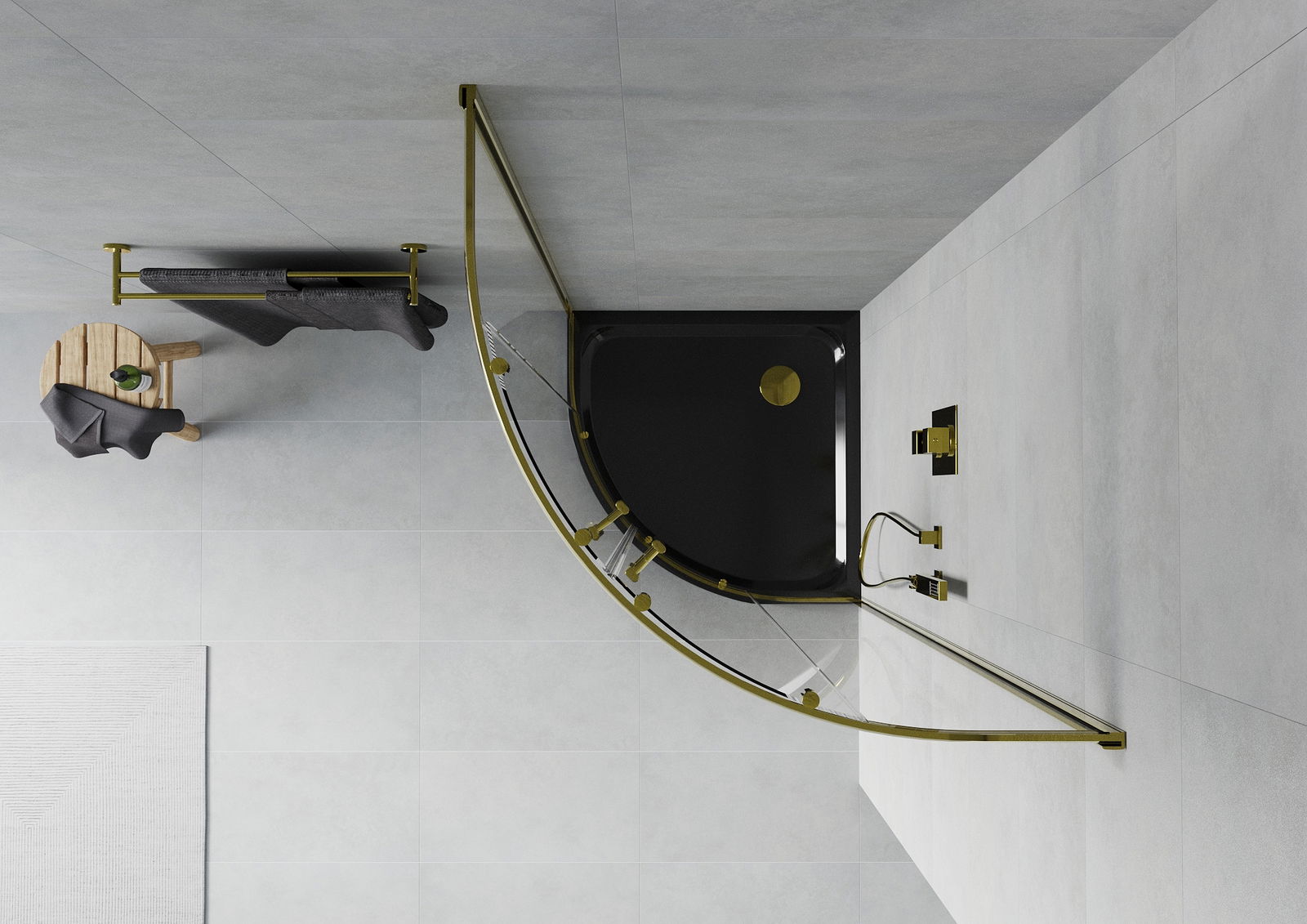Mexen Rio pusapvalė dušo kabina 80 x 80 cm, skaidri, auksinė + plokščia juoda dušo plokštė - 863-080-080-50-00-4170G