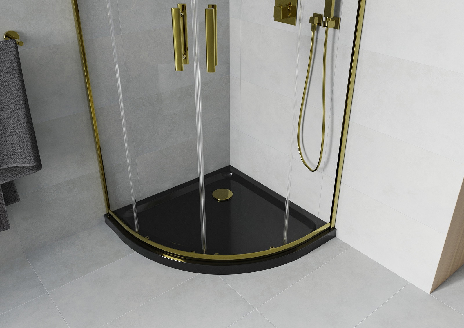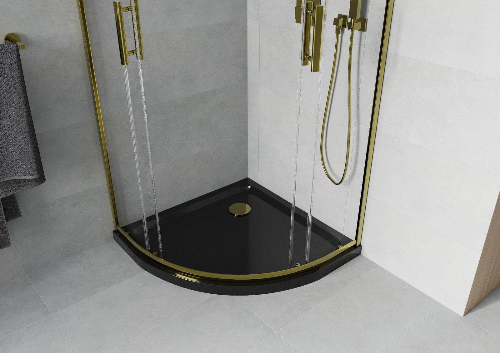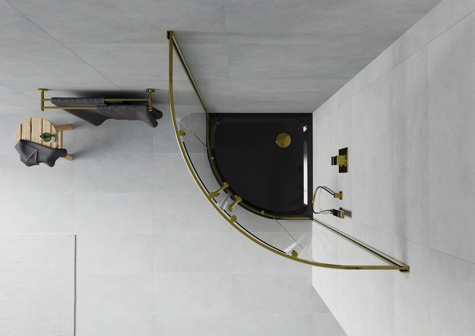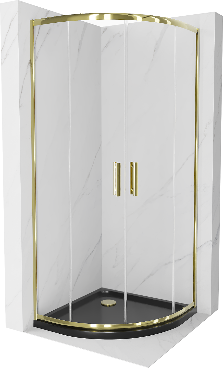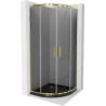 Mexen Rio pusapvalė dušo kabina 90 x 90 cm, skaidri, auksinė + juodas plokščias padėklas - 863-090-090-50-00-4170G