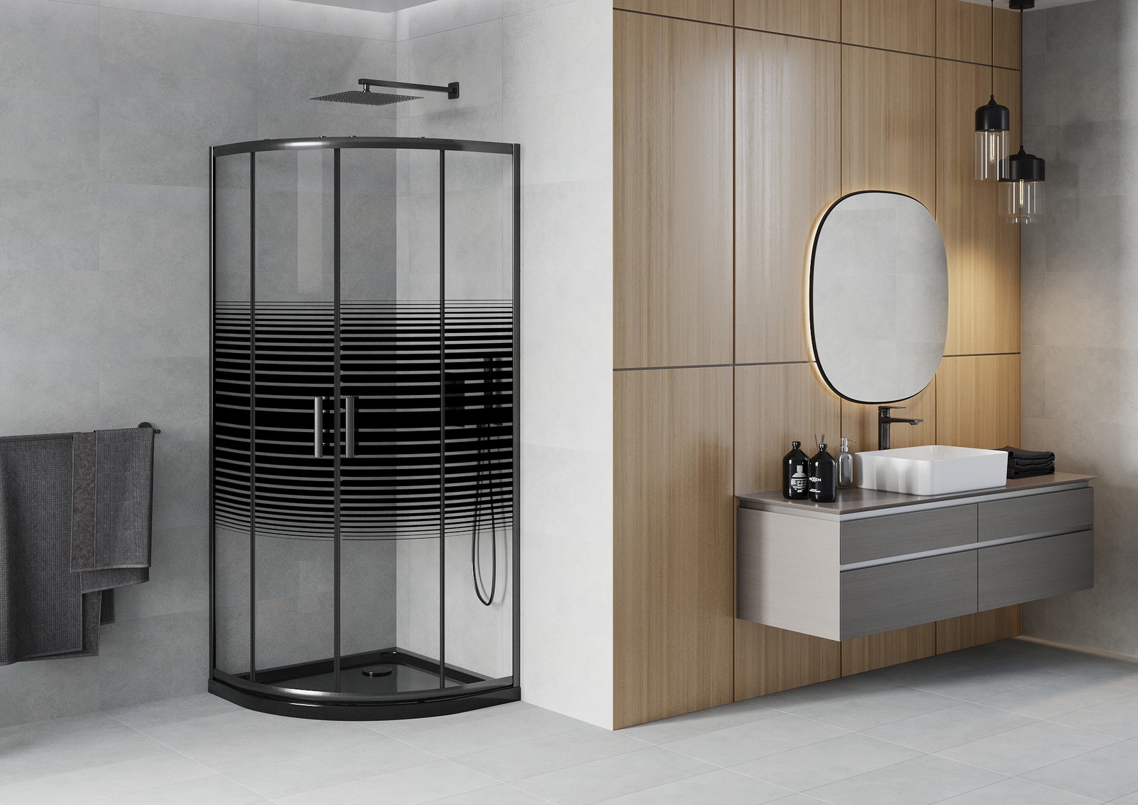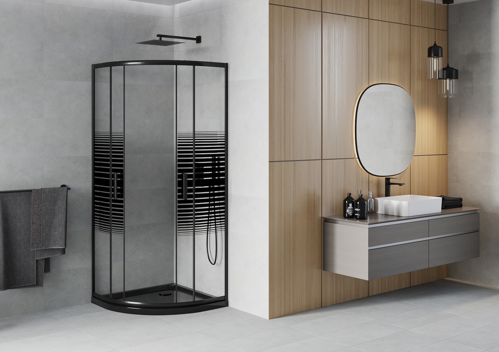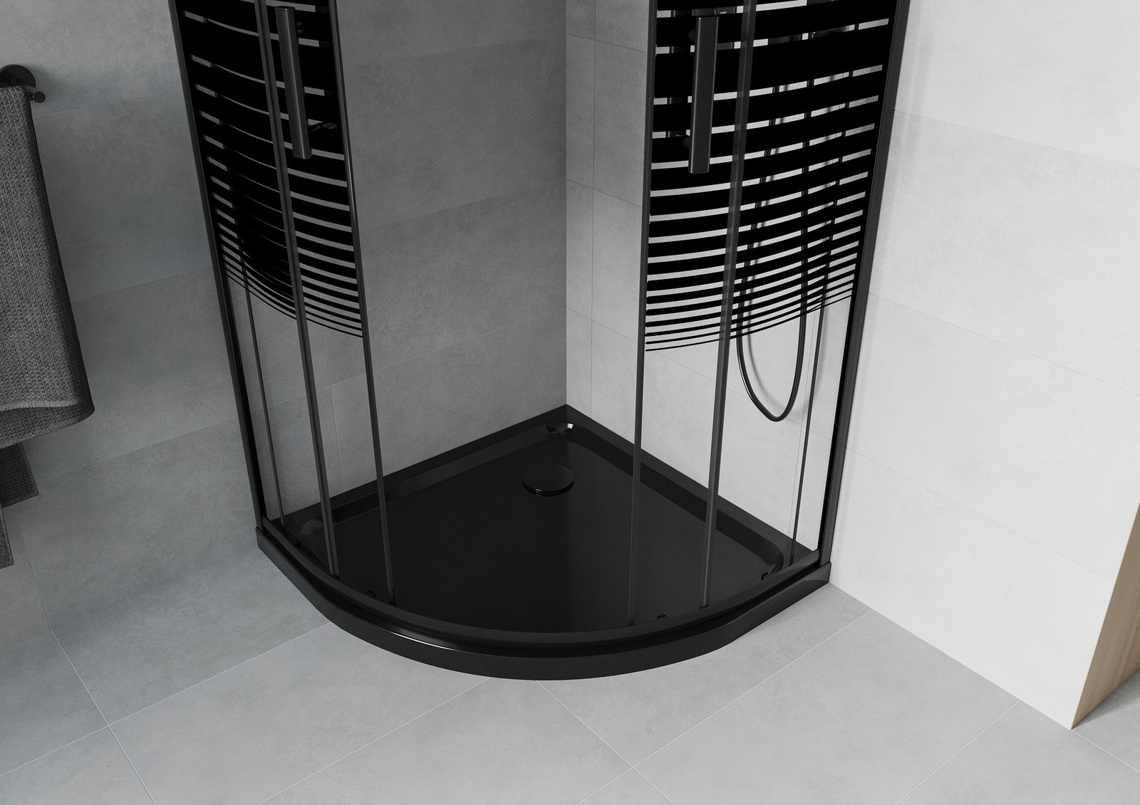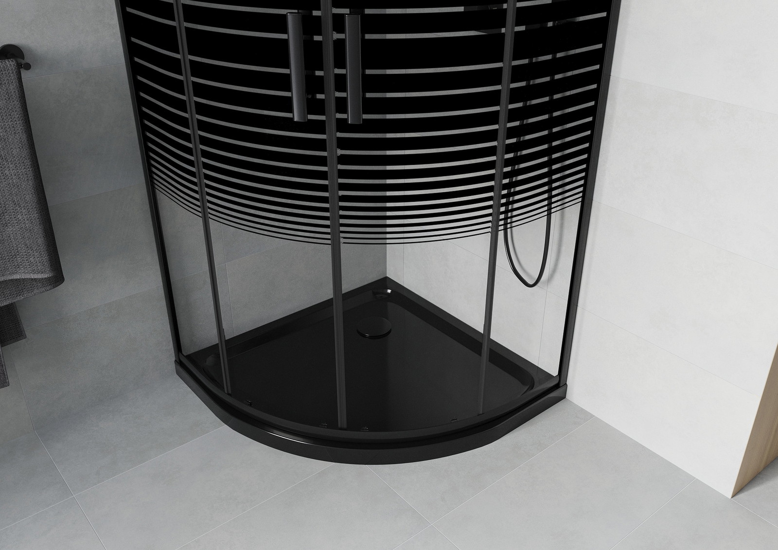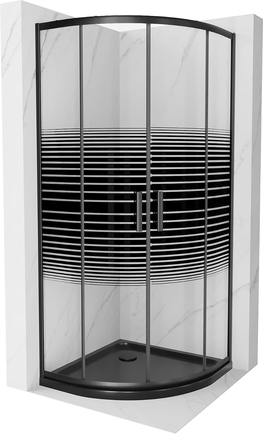 Mexen Rio pusapvalis dušo kabina 80 x 80 cm, juodos juostos, juoda + Flat padėklas, juodas - 863-080-080-70-20-4170B