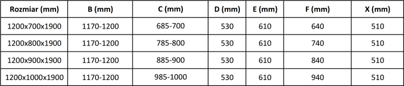 Dušo kabinos, durys ir sienelės yra standartiškai pritaikytos montuoti ant nustatytų matmenų dušo padėklų. Būtent šie matmenys nurodomi gaminio pavadinime arba aprašyme. Tačiau atkreipkite dėmesį, kad faktiniai elementų matmenys gali šiek tiek skirtis nuo vardinių verčių. Planuojant montuoti tiesiai ant grindų, rekomenduojama atidžiai patikrinti išorinius matmenis ir elementų išdėstymą pagal techninį brėžinį.