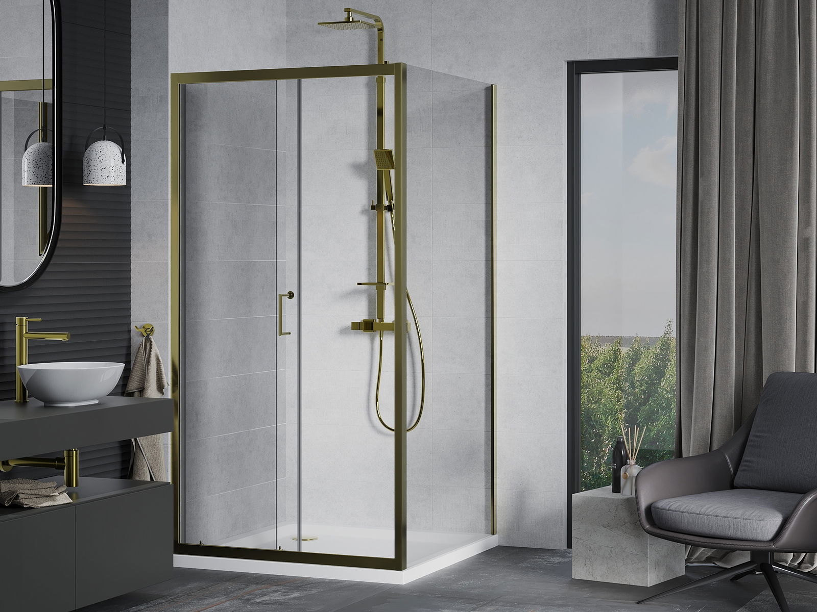 Mexen Apia 90 x 90 cm stumdoma dušo kabina, permatoma, auksinė + Flat padėklas, baltas- 840-090-090-50-00-4010G