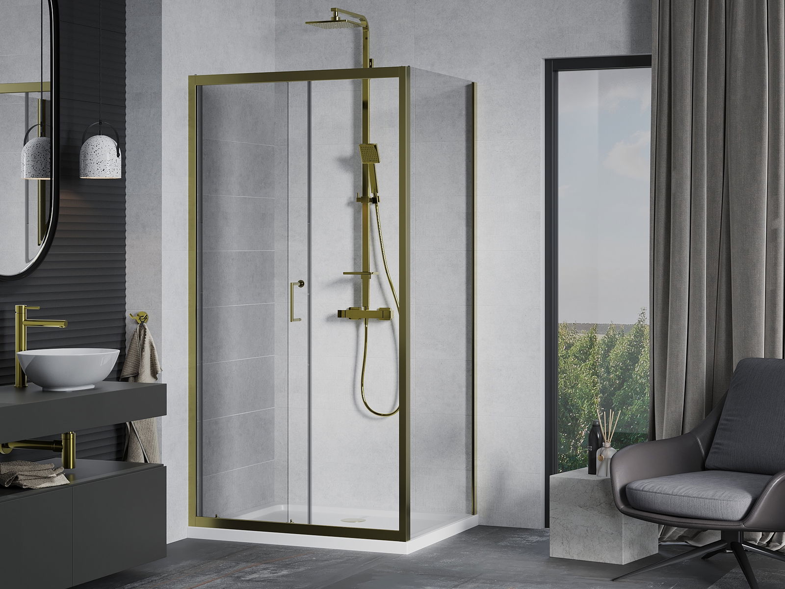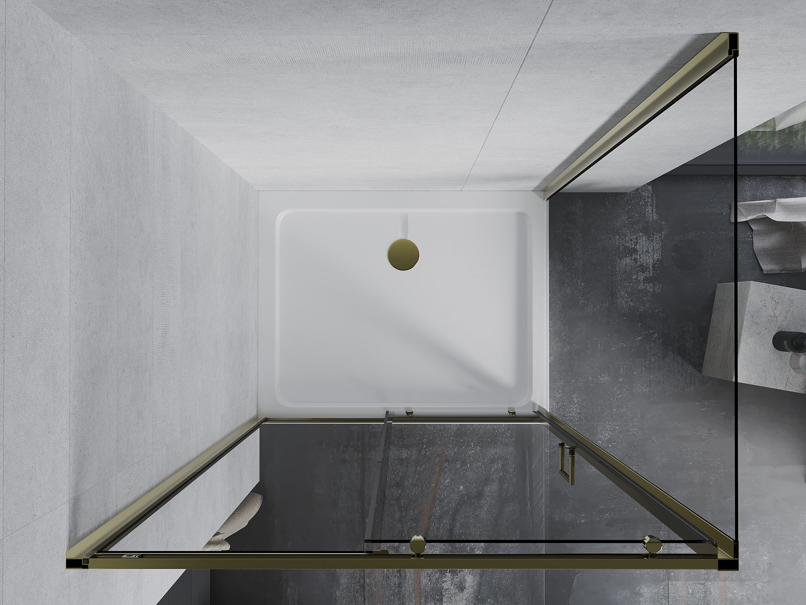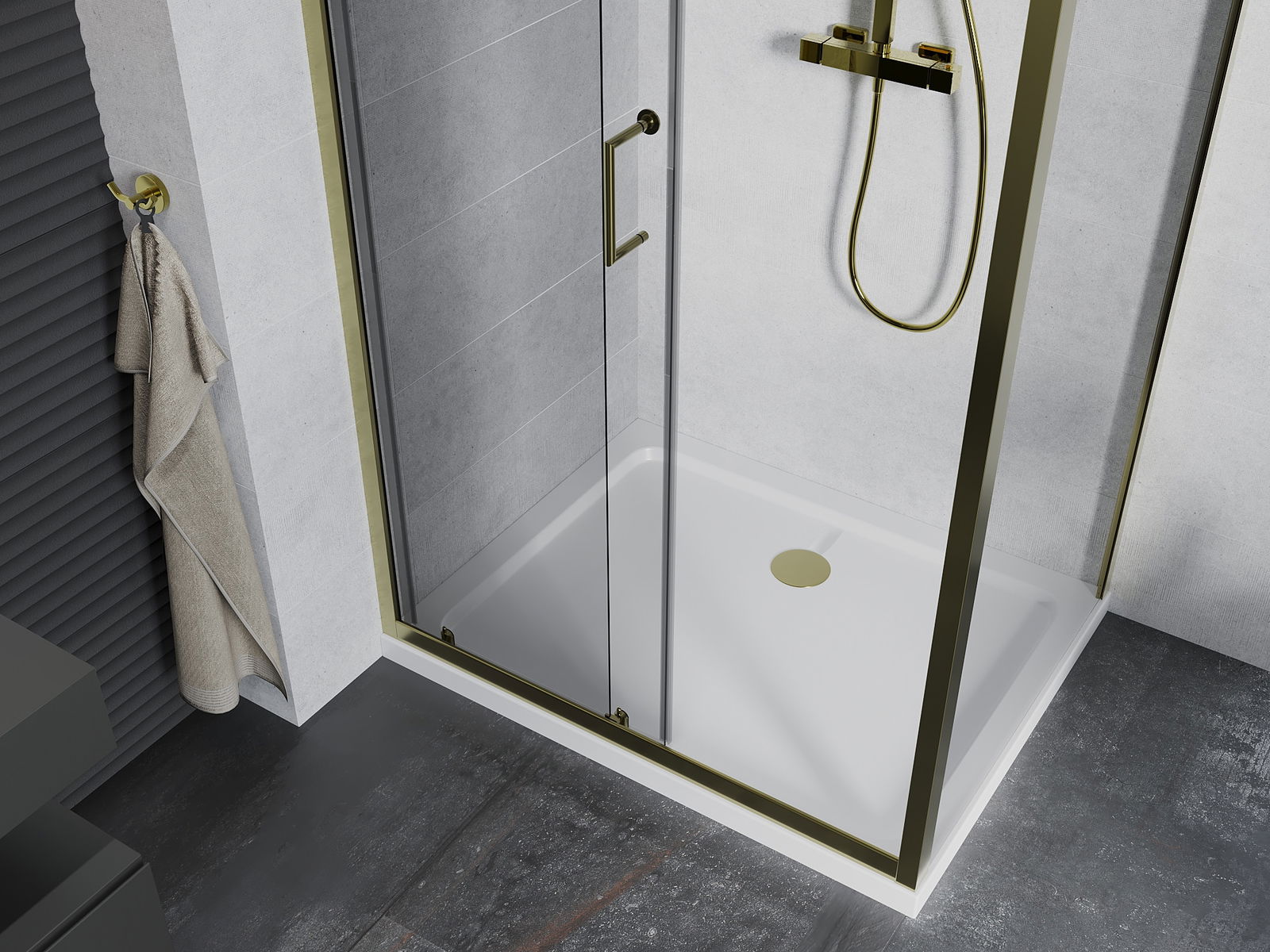 Mexen Apia stumdomas dušo kabina 110 x 70 cm, skaidrus, auksinė + Flat padėklas, baltas- 840-110-070-50-00-4010G