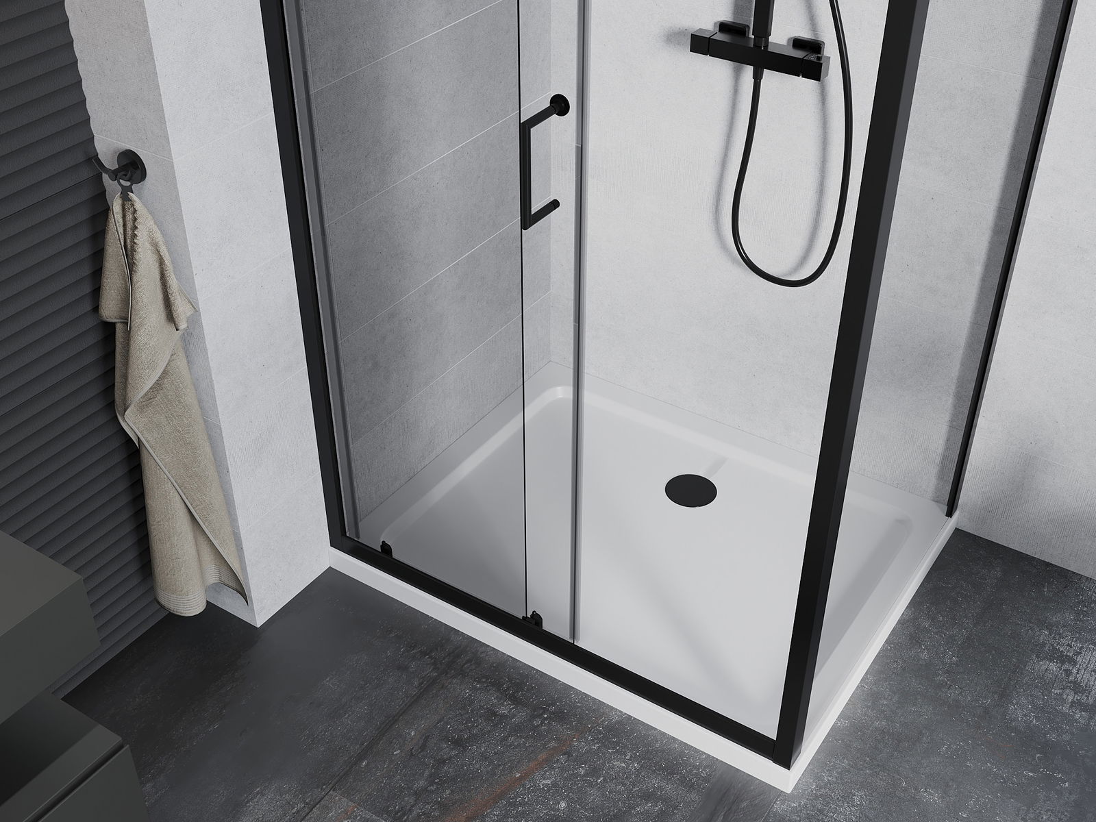 Mexen Apia slankioji dušo kabina 90 x 80 cm, skaidri, juoda + Flat dušo padėklas, baltas- 840-090-080-70-00-4010B