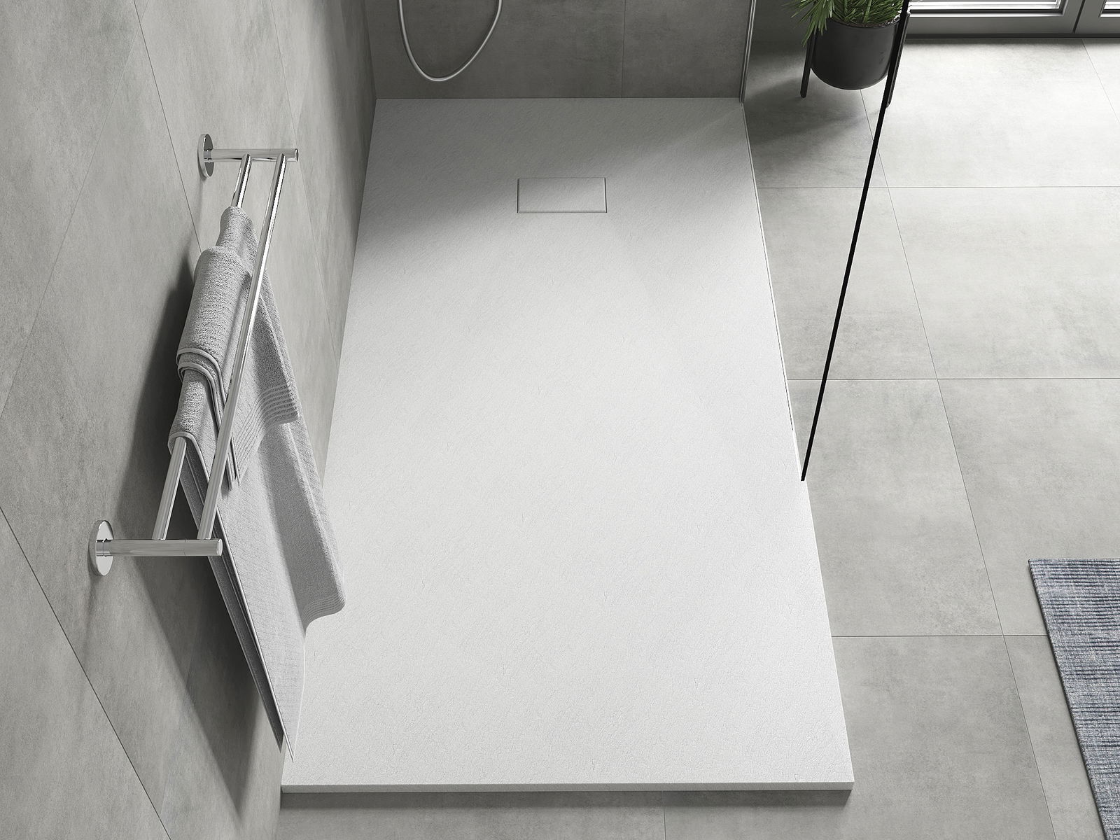Dušo dėklo paviršius primena akmenį su jo struktūra. Tai unikalus natūralios išvaizdos derinys su šiuolaikišku interjero išdėstymu. Tai prideda charakterio, pabrėžia vonios dekoro estetiką ir eleganciją bei daro įspūdį savo forma.