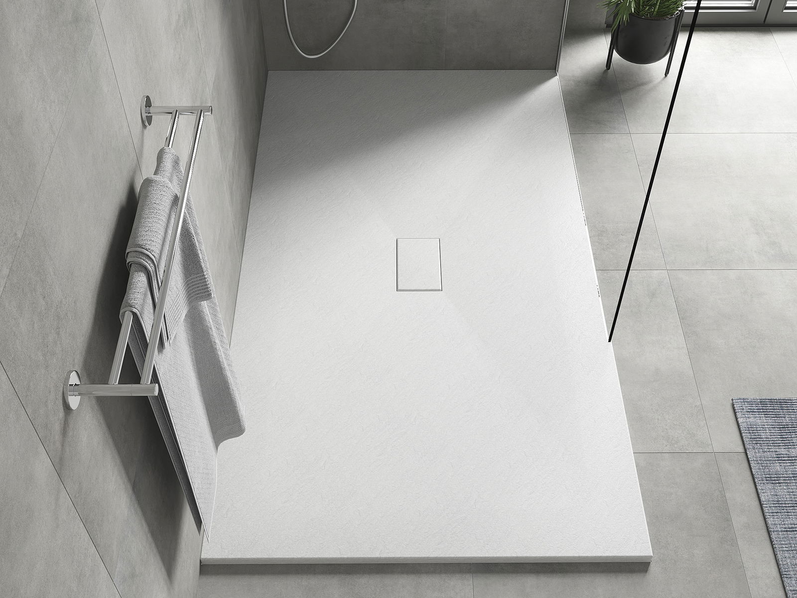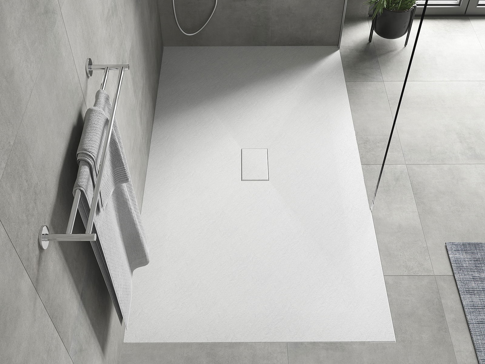 Dušo dėklo paviršius primena akmenį su jo struktūra. Tai unikalus natūralios išvaizdos derinys su šiuolaikišku interjero išdėstymu. Tai prideda charakterio, pabrėžia vonios dekoro estetiką ir eleganciją bei daro įspūdį savo forma.