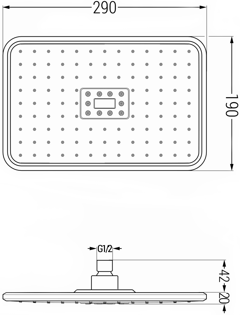 Lietaus dušo galvutė turi guminius purkštukus, kurie apsaugo nuo kalkių nuosėdų kaupimosi