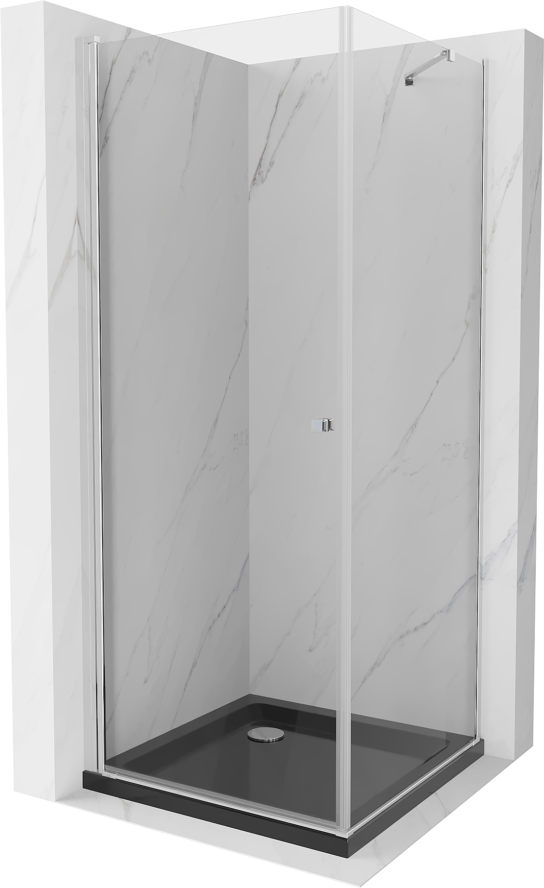 Mexen Pretoria atsilenkiama dušo kabina 90 x 90 cm, permatomi stiklai, chromo spalva + juodas Flat padėklas