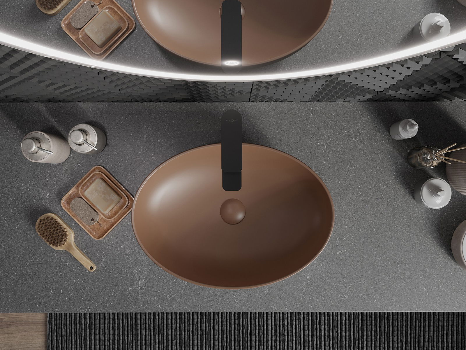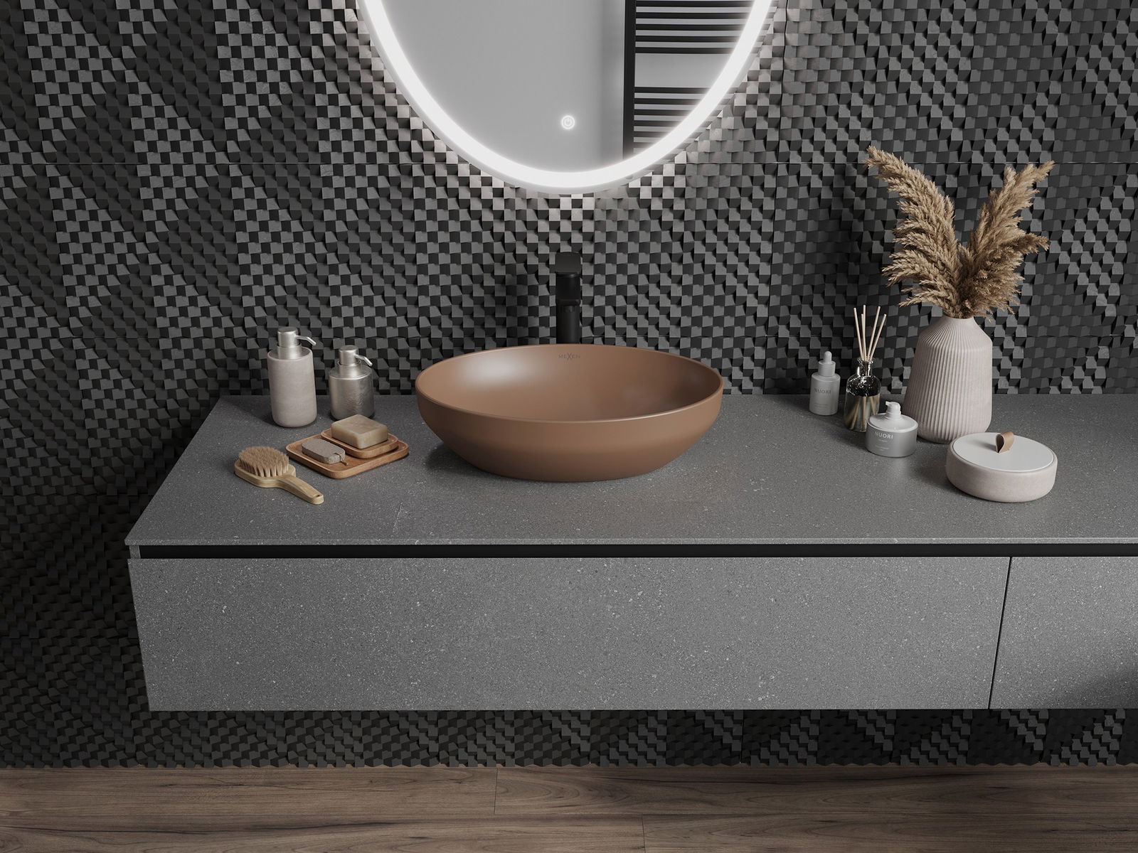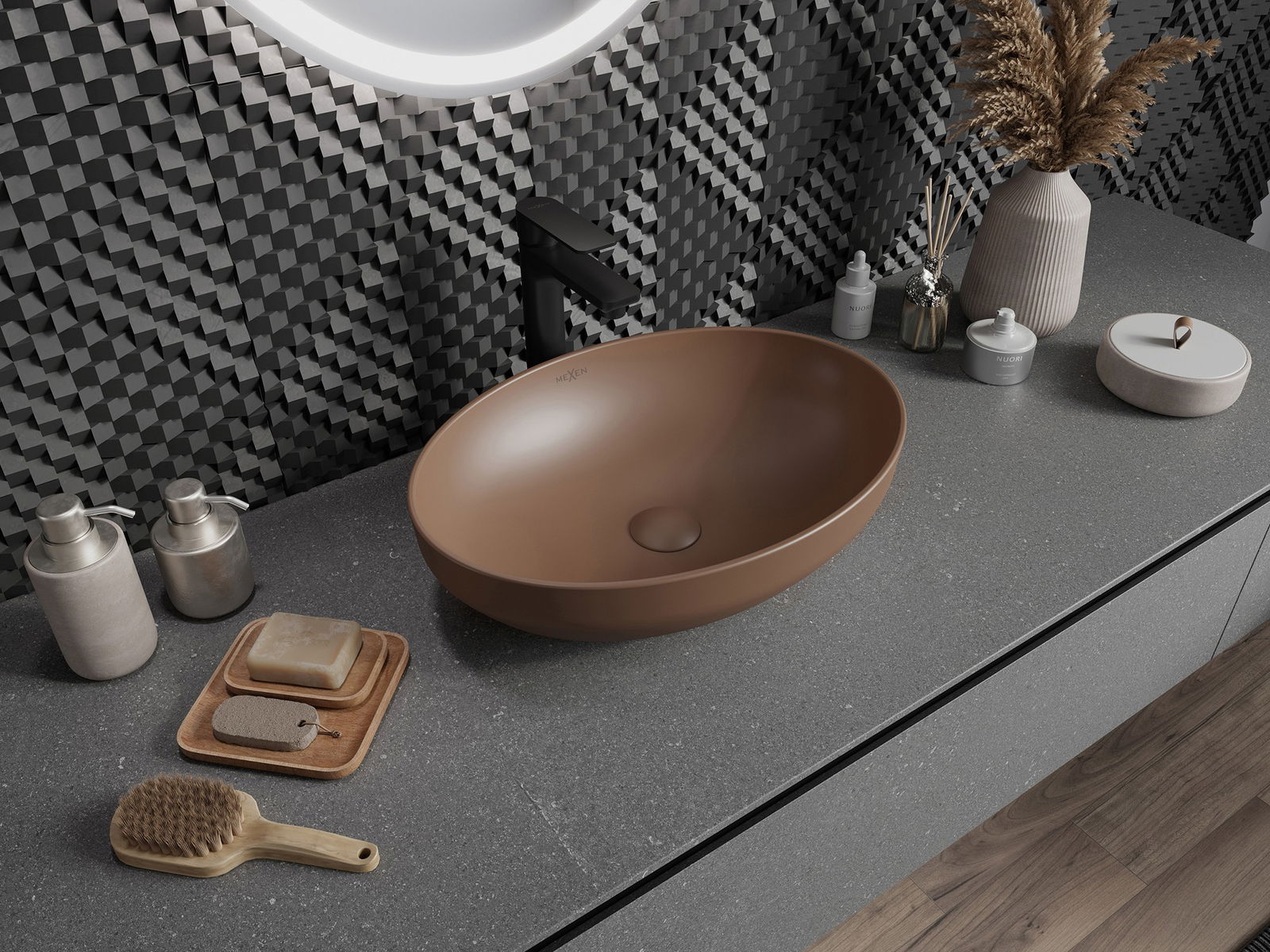Matte keramikos paviršius puikiai pabrėžia produkto spalvos pobūdį, suteikdamas jai unikalų ir išraiškingą apdailą. Subtili matinės keramikos struktūra pristato eleganciją vonios kambaryje, sukurdama estetinę erdvę.