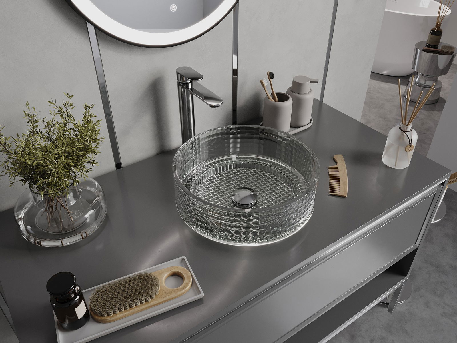 Kriauklė išsiskiria unikalia kristalų struktūra, suteikdama jai unikalų ir ypač efektyvų vaizdą. Kristalai šviečia šviesoje, patraukdami akis ir pridedant elegancijos. Praktinis ir stilingas sprendimas kiekvienam vonios kambariui.