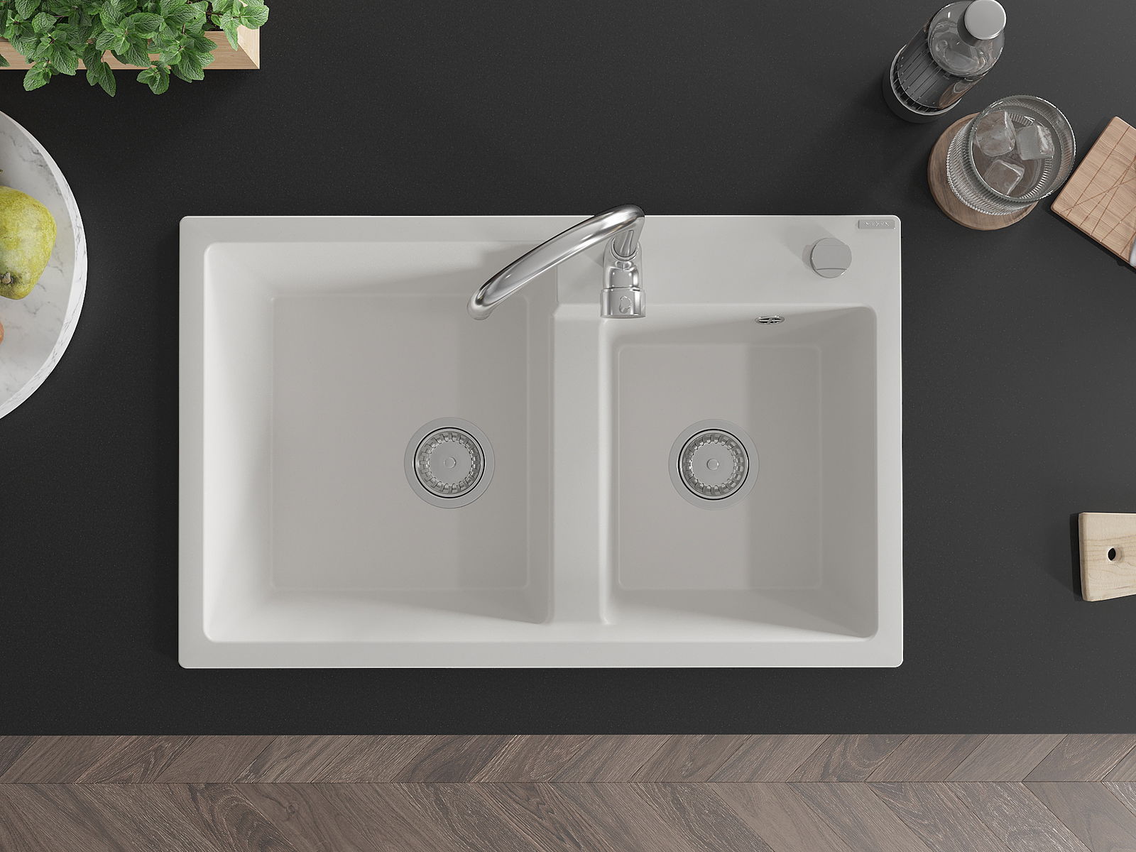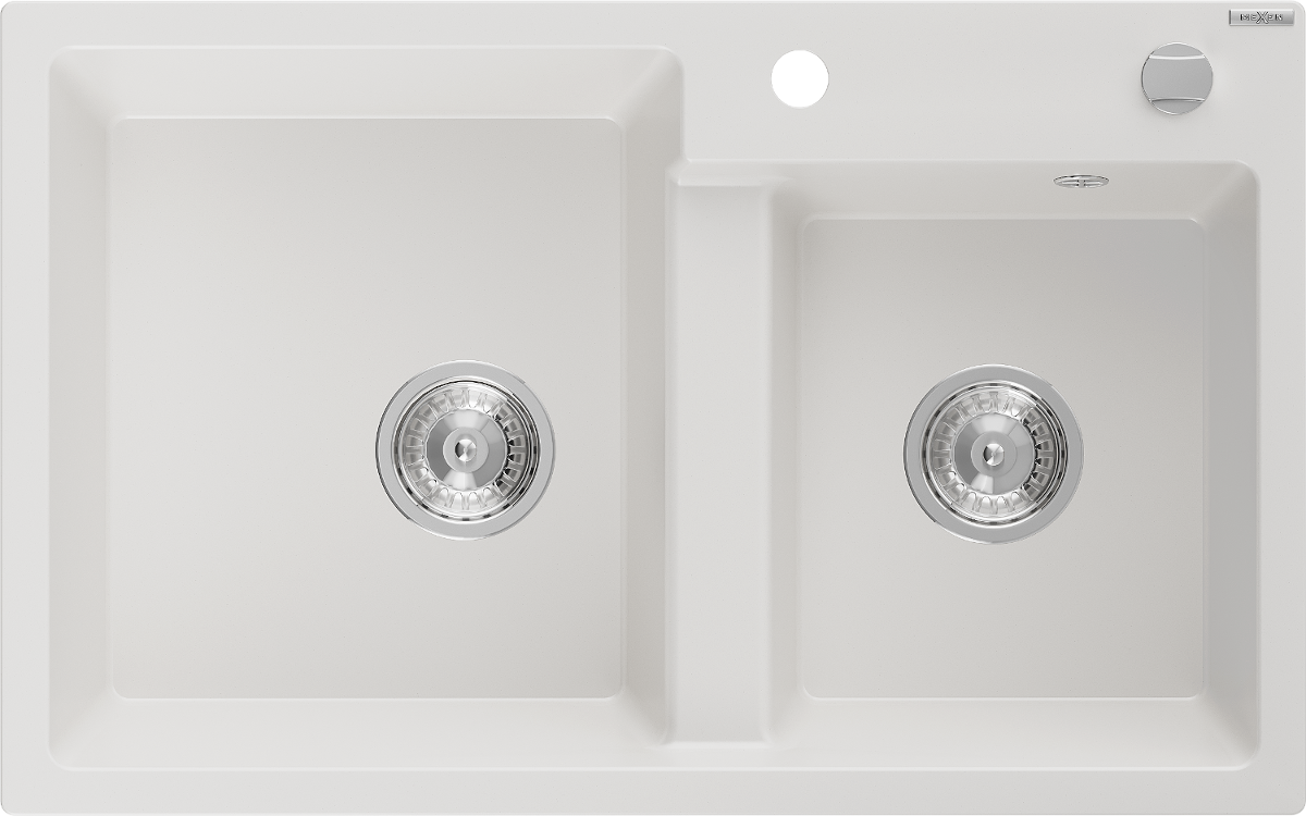 Mexen Tomas granitinė dviejų kamerų kriauklė 800 x 500 mm, balta, sifonas chromuotas - 6516802000-20
