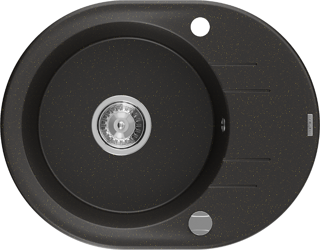 Mexen Kevin granitinė vienos kameros kriauklė su nutekamuoju indu 586 x 458 mm, juoda/auksinis metalikas, chromo sifonas