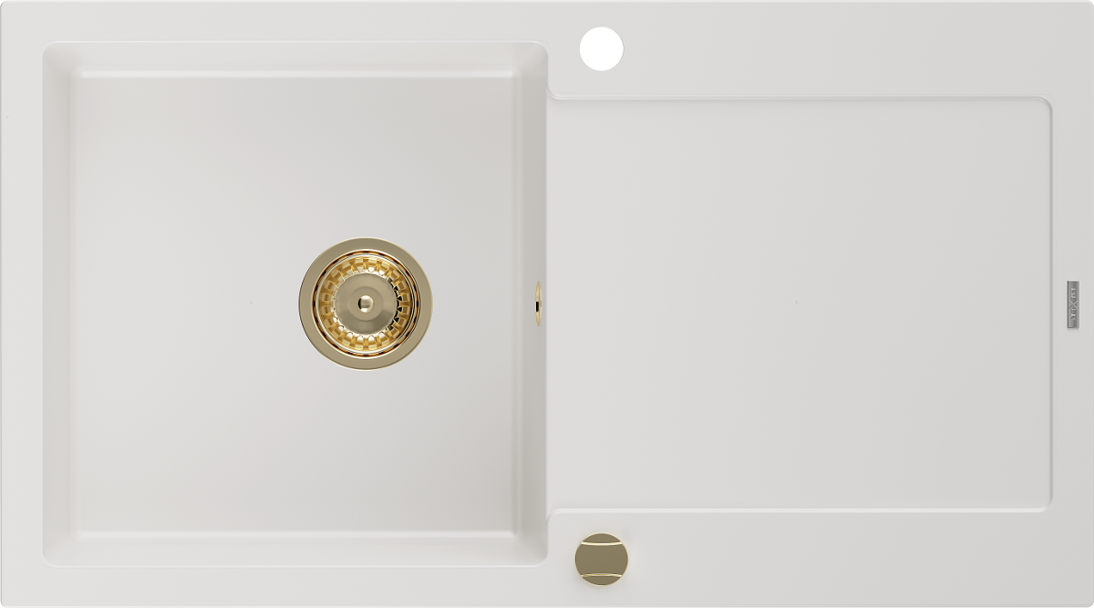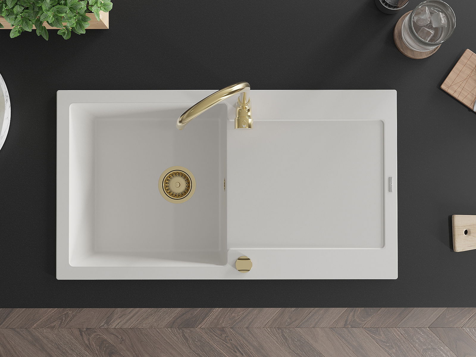 Mexen Leo granito kriauklė su viena kamera ir nutekėjimo vieta 900 x 500 mm, balta, auksinis sifonas - 6501901010-20-G
