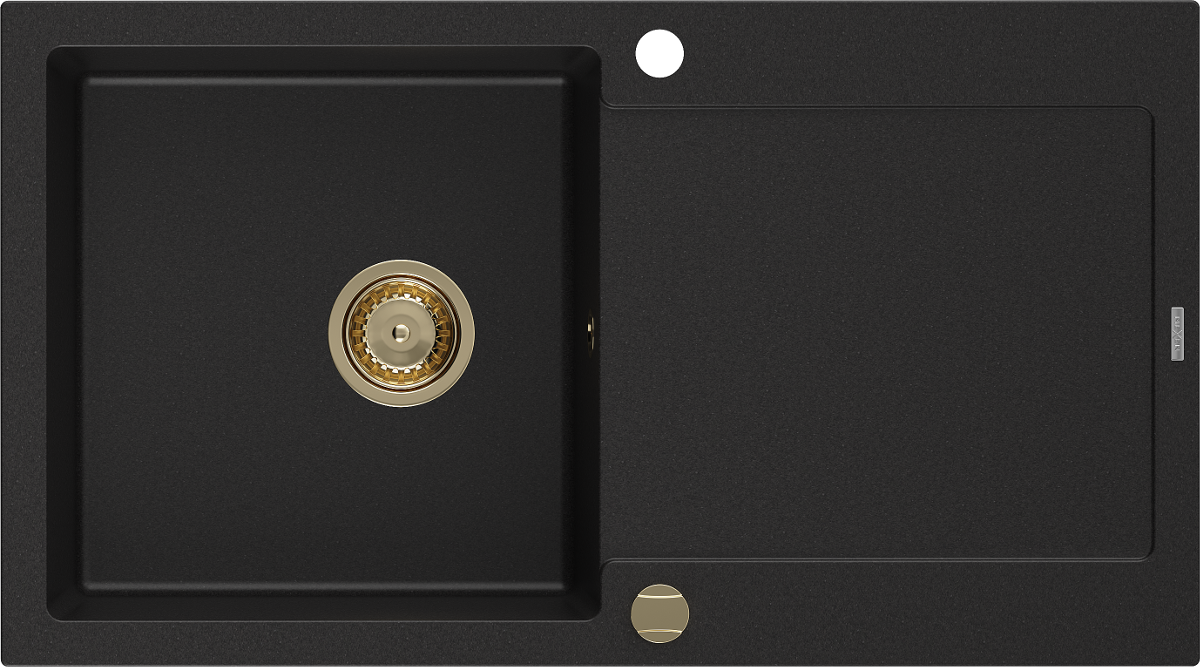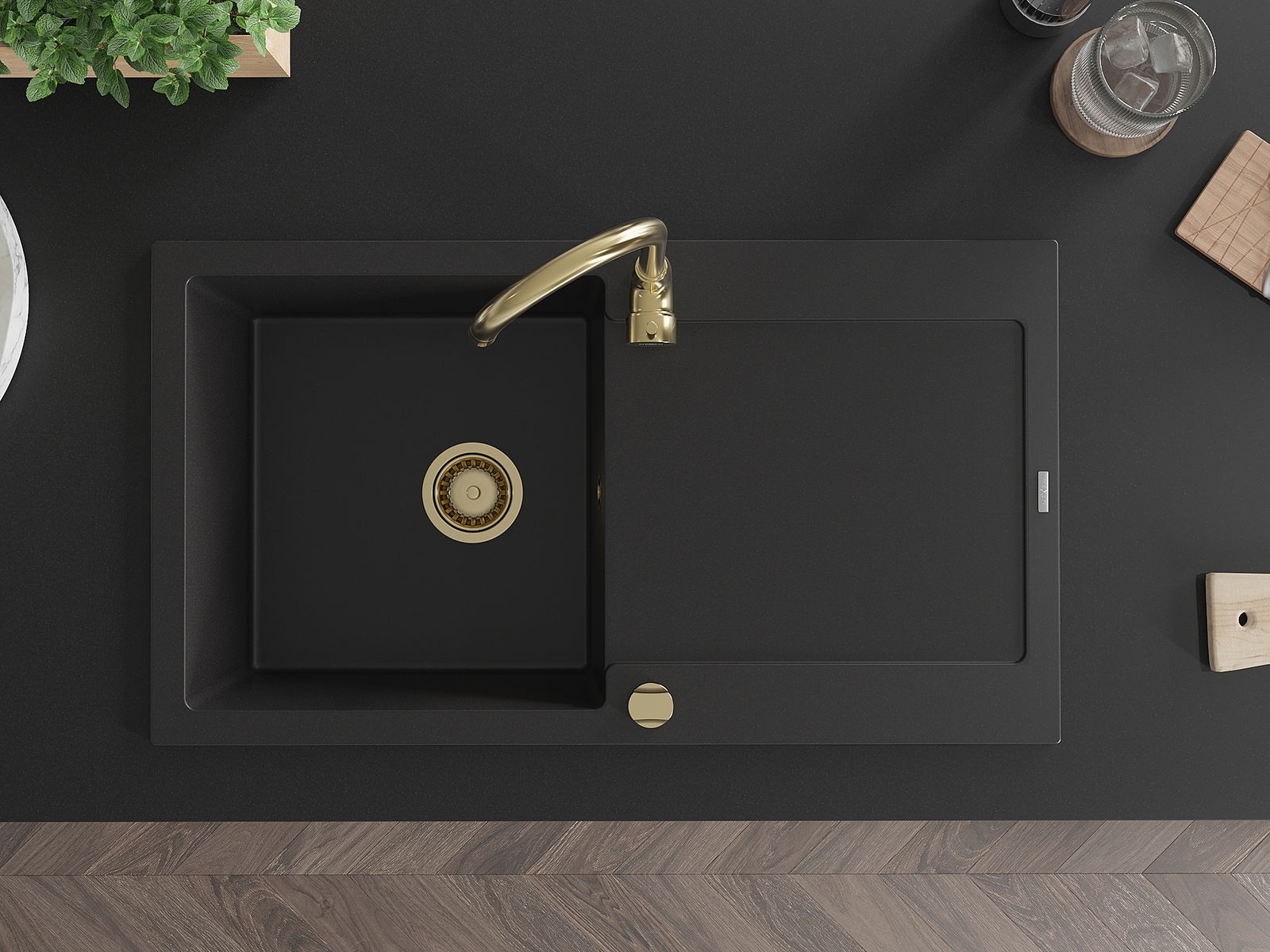 Mexen Leo granito plautuvė viena kamera su nusausinimu 900 x 500 mm, juoda, auksinis sifonas - 6501901010-77-G