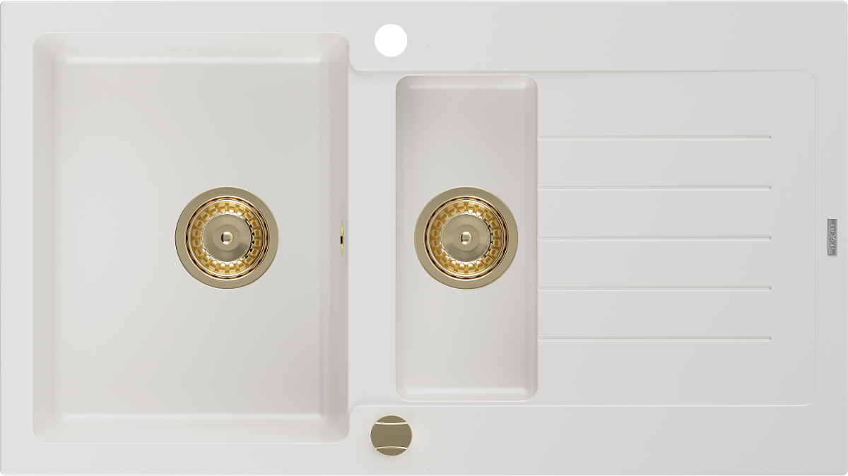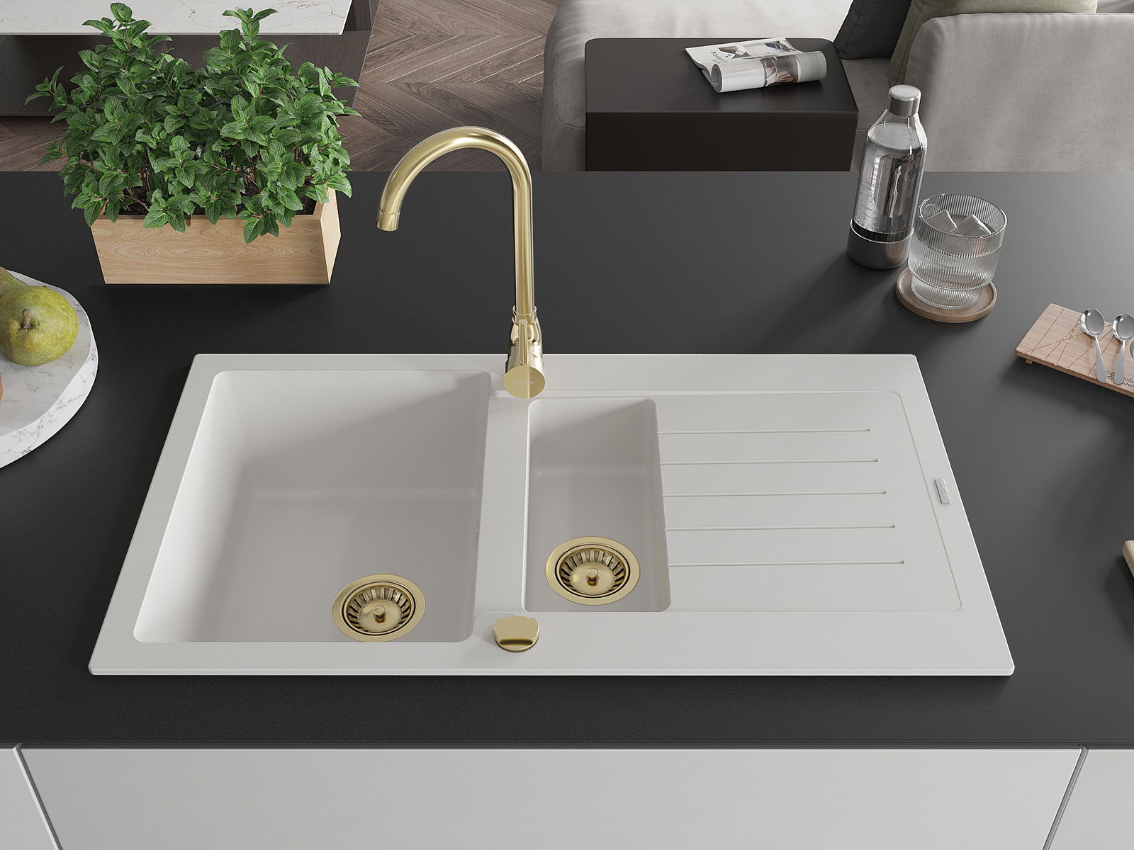 Mexen Matias granito kriauklė 1,5 skyrių su nutekamuoju paviršiumi 900 x 505 mm, balta, auksinis sifonas - 6502901505-20-G