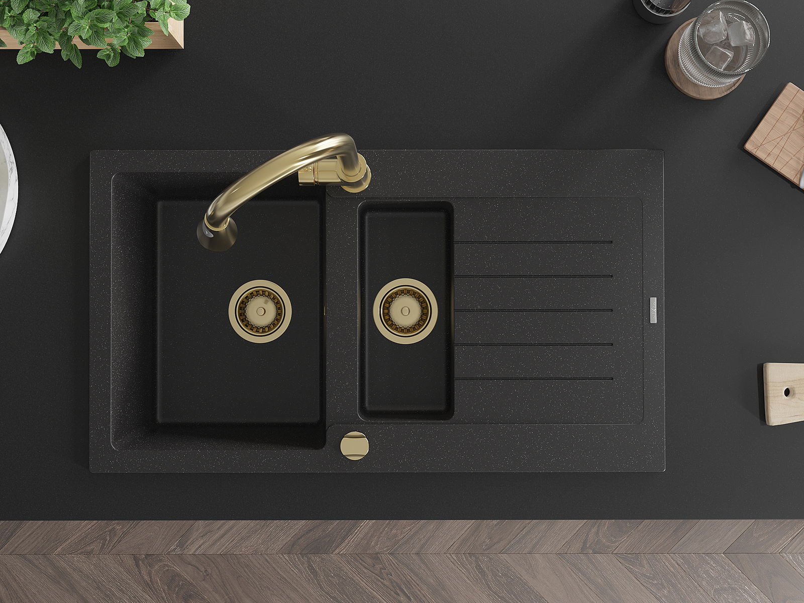 Mexen Matias granitinė kriauklė 1,5 skyrių su drenažu 900 x 505 mm, juoda/sidabrinė metalo, aukso sifonas - 6502901505-73-G