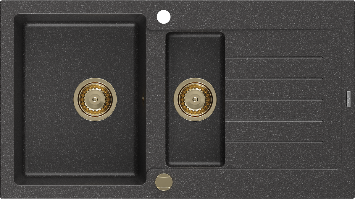 Mexen Matias granito plautuvė 1,5 skyrių su nutekėjimo sistema 900 x 505 mm, juoda dėmėta, auksinė sifonas - 6502901505-76-G