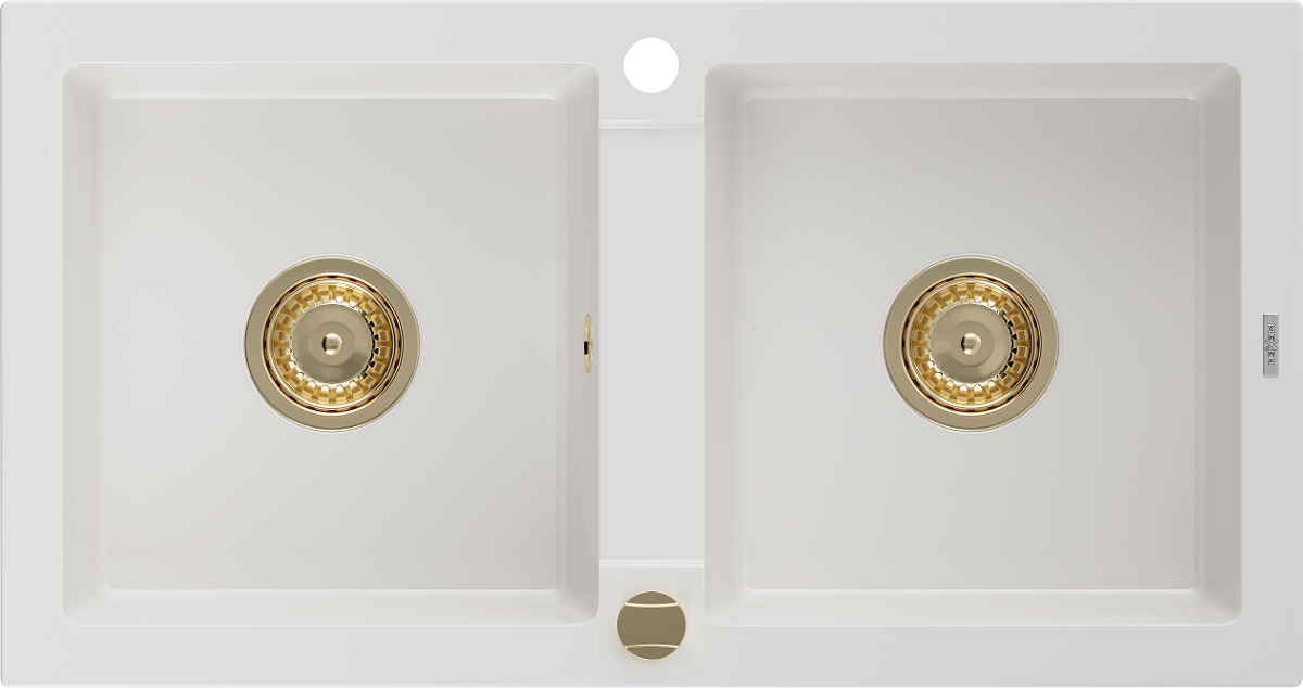 Mexen Mario granitinė dviejų kamerų kriauklė 820 x 436 mm, balta, auksinis sifonas - 6504822000-20-G
