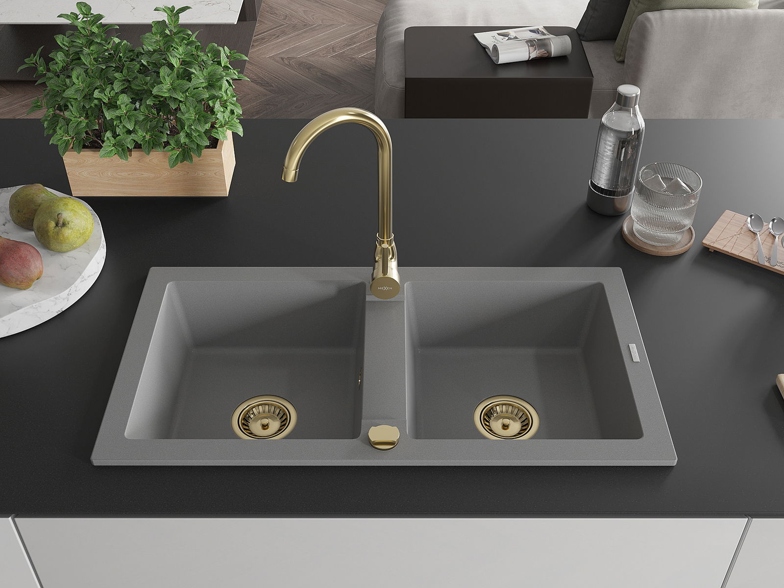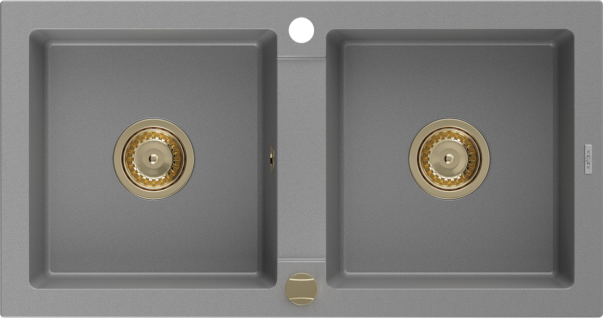 Mexen Mario granito plautuvė su dviem kameromis 820 x 436 mm, pilka, auksinis sifonas - 6504822000-71-G