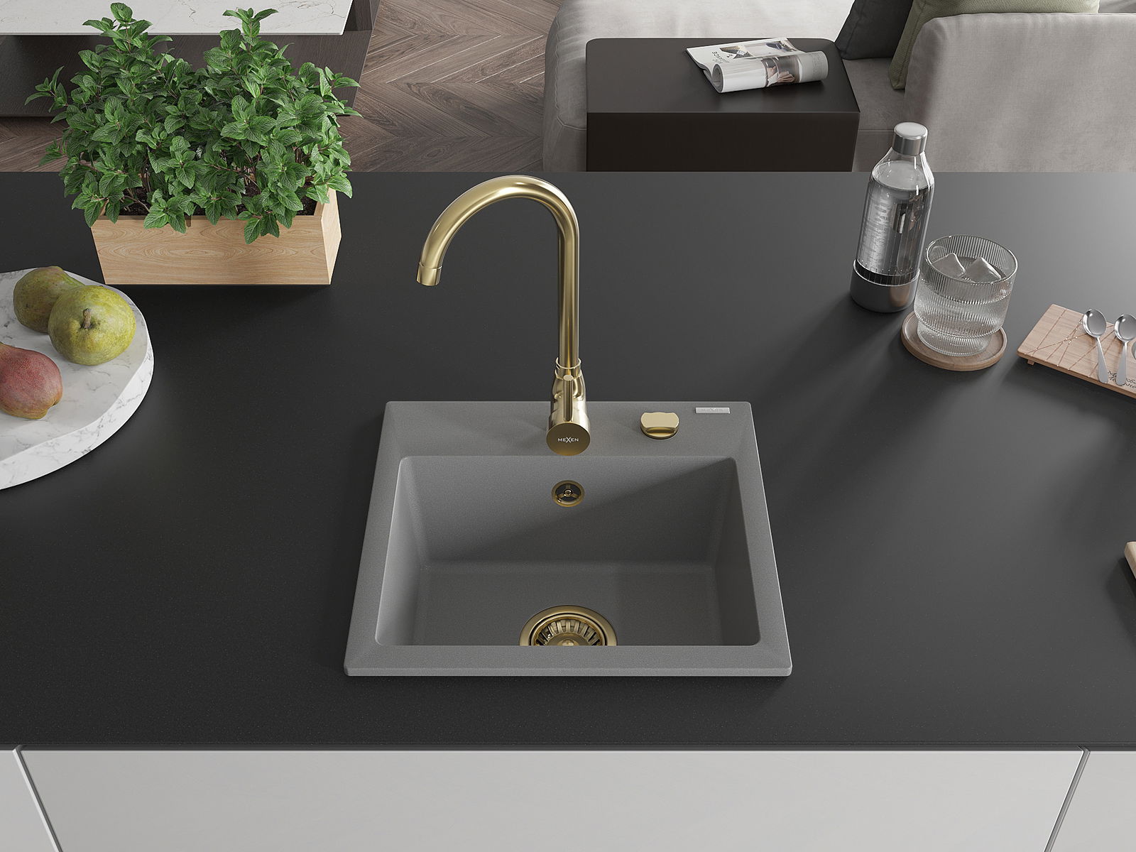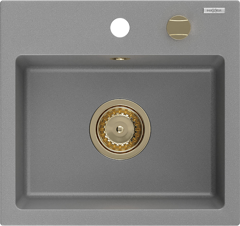 Mexen Milo granitinis vienos kameros plautuvė 435 x 410 mm, pilka, auksinis sifonas - 6505441000-71-G