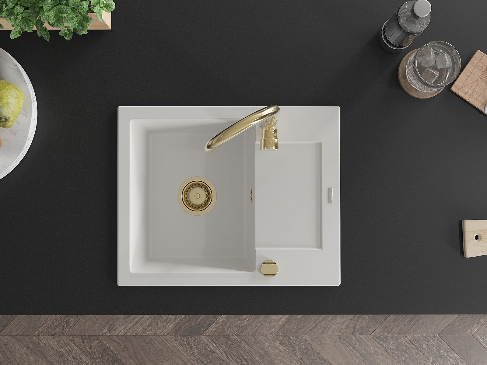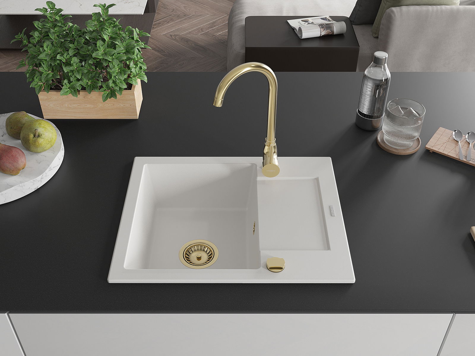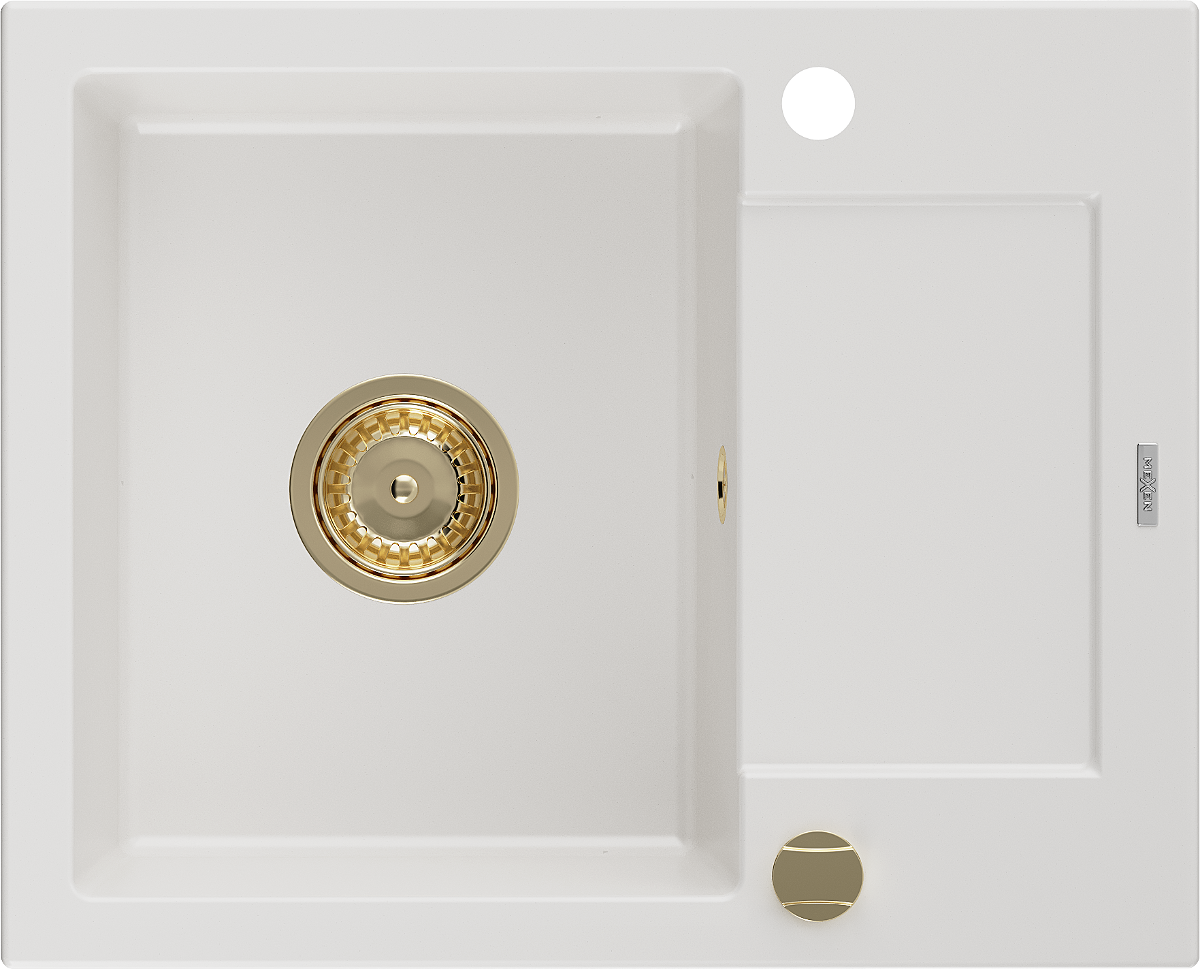 Mexen Enzo granito Plautuvė; 1 skyrius su nutekamuoju paviršiumi 576 x 465 mm, balta, sifonas auksinis - 6506571005-20-G