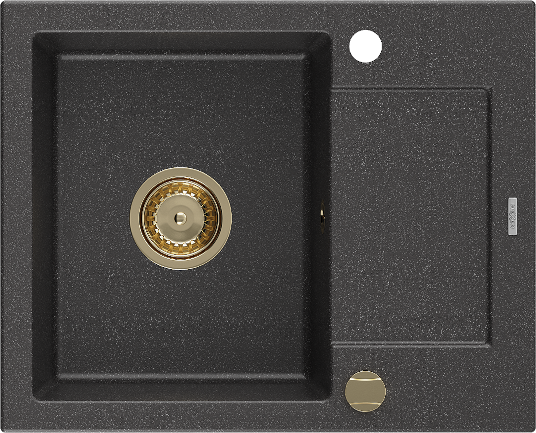 Mexen Enzo granitinė kriauklė 1 skyrius su lašėtuvu 576 x 465 mm, juoda dėmėta, sifonas auksinis - 6506571005-76-G