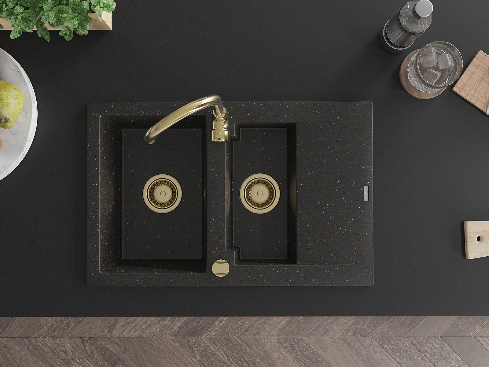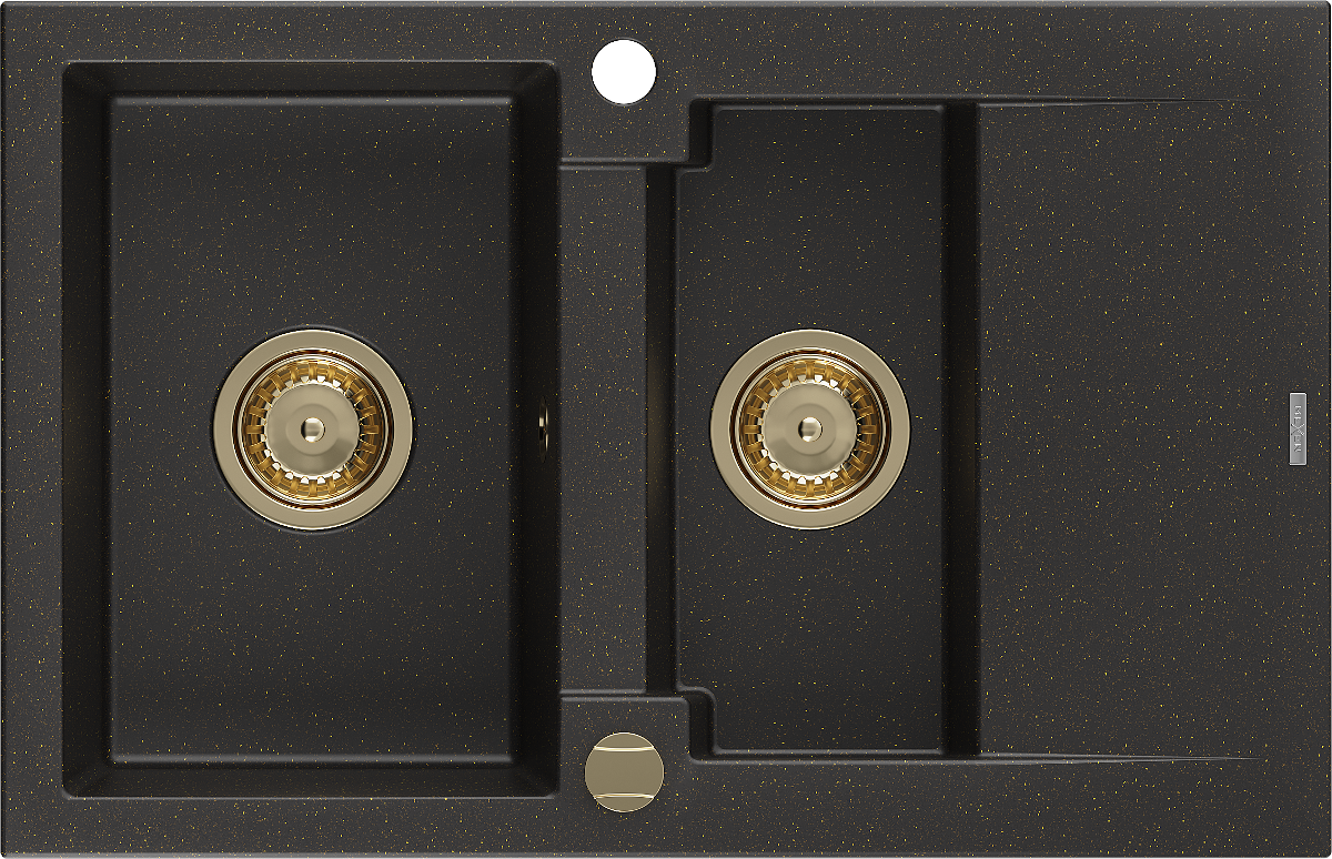 Mexen Gaspar granitinė 1,5 dubens kriauklė su nusausintuvu 737 x 475 mm, juoda/auksinis metalikas, auksinis sifonas
