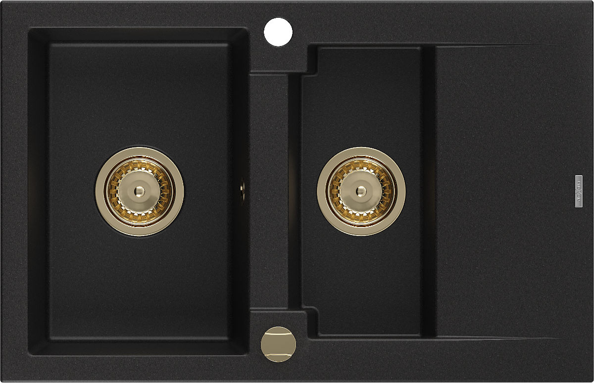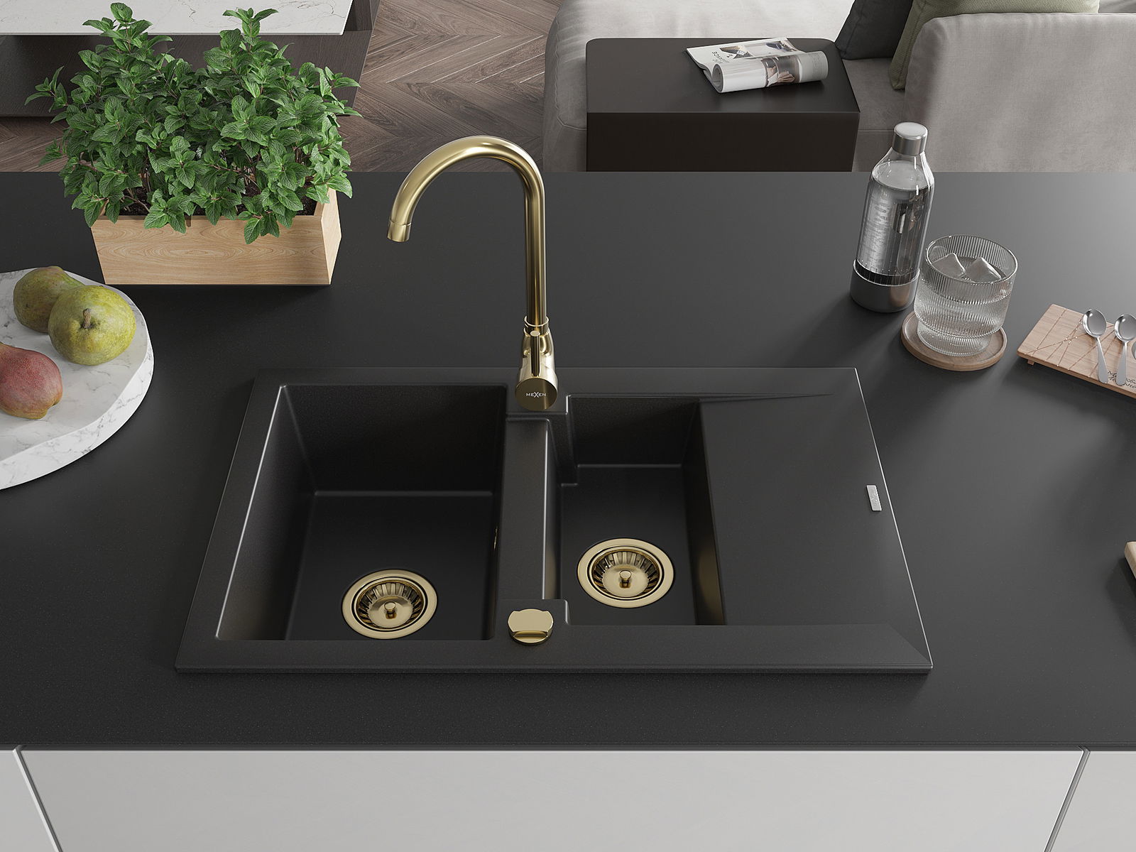 Mexen Gaspar granito plautuvė 1,5 kamerų su nutekėjimu 737 x 475 mm, juoda, auksinis sifonas - 6507731505-77-G
