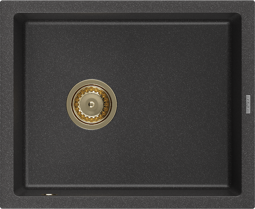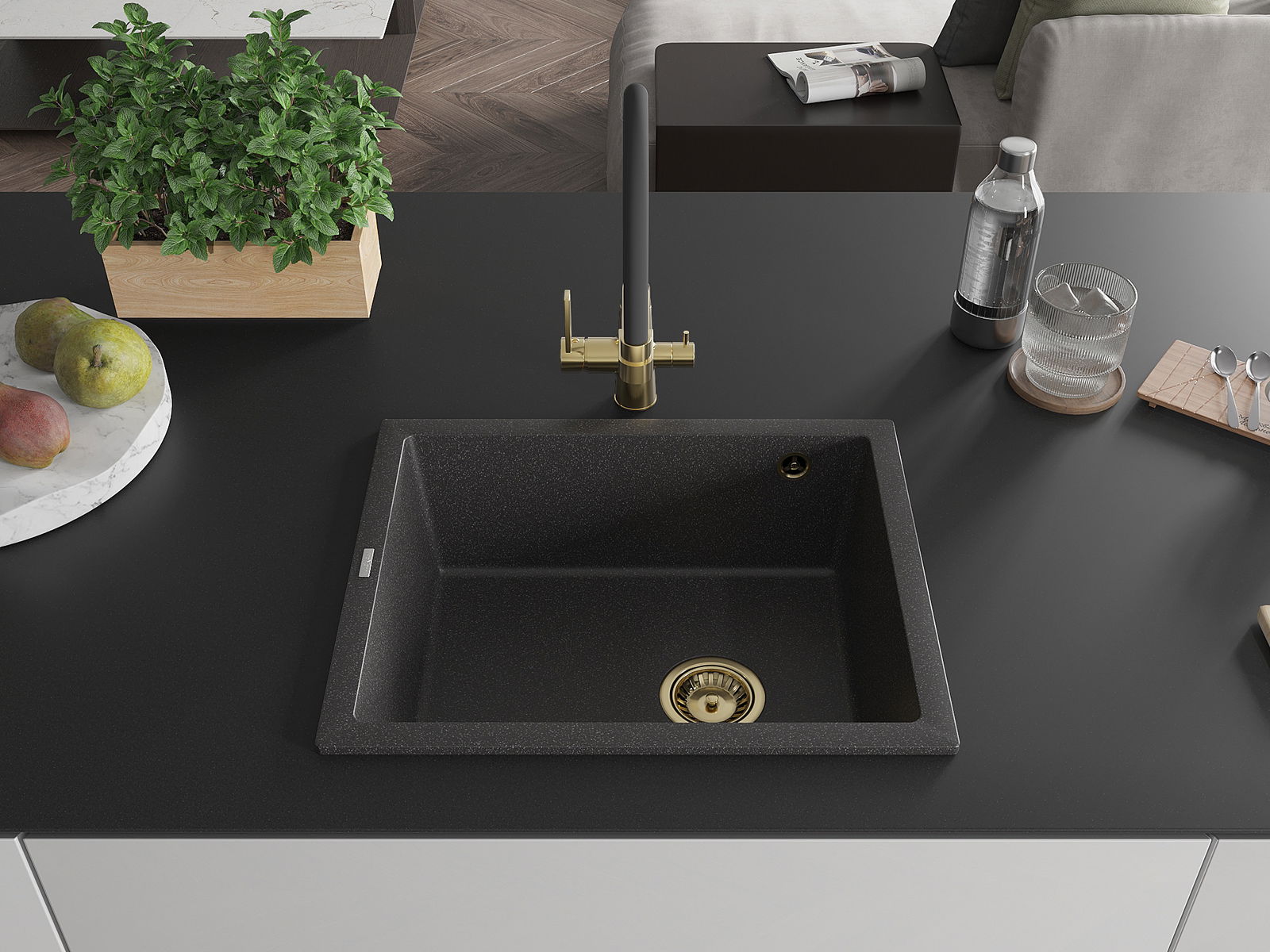 Mexen Pedro granitinis vienos kameros virtuvinis kriauklė 560 x 460 mm, juodas dėmėtas, sifonas auksinis - 6508561000-76-G