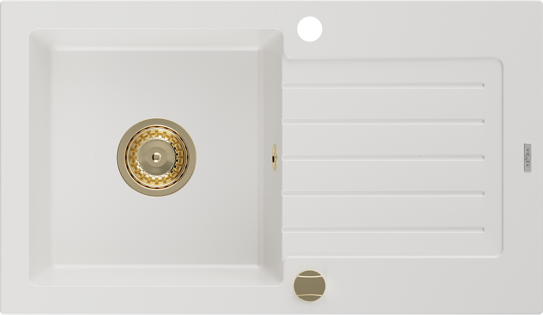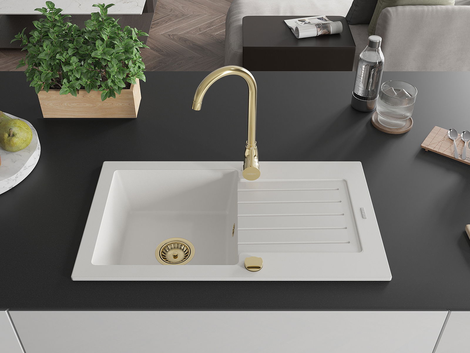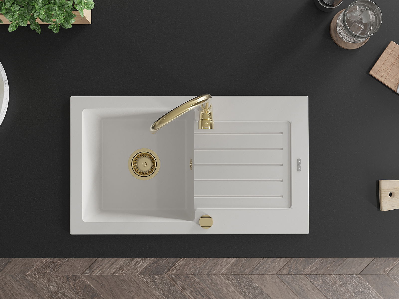 Mexen Pablo granitinis virtuvės kriauklė 1-dubens su nutekėjimu 752 x 436 mm, baltas, auksinis sifonas - 6510751010-20-G