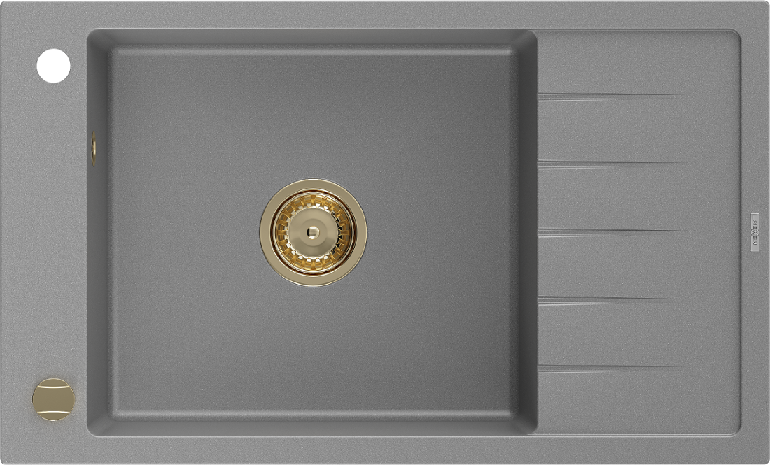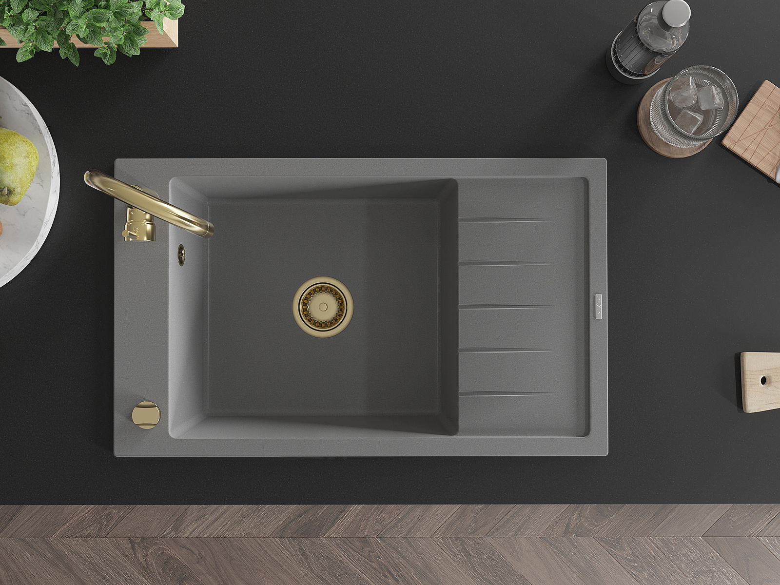 Mexen Elias granitinė vienos kameros plautuvė su nutekamąja dalimi 795 x 480 mm, pilka, aukso sifonas - 6511791005-71-G