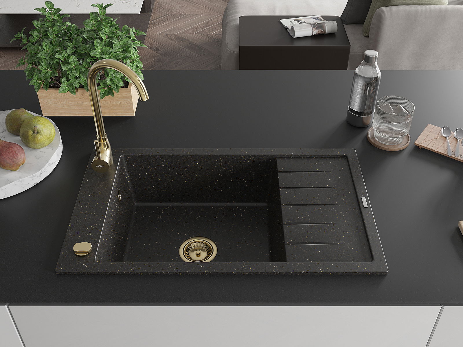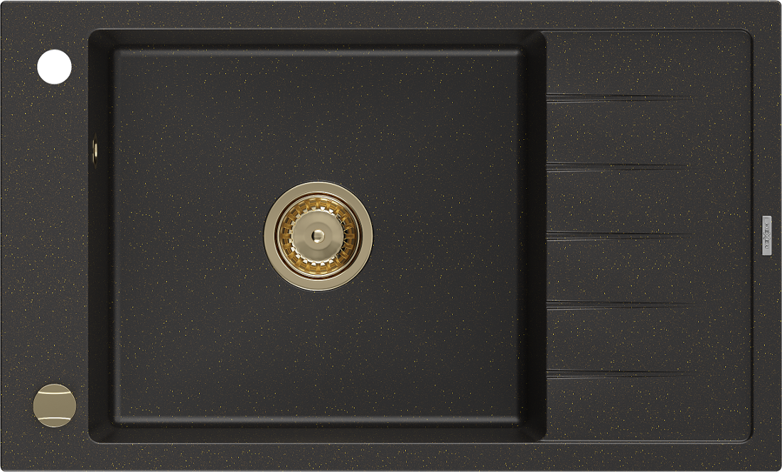 Mexen Elias Granitinė 1 skyrelio kriauklė su nusausintuvu 795 x 480 mm, juoda/auksinis metalikas, auksinis sifonas