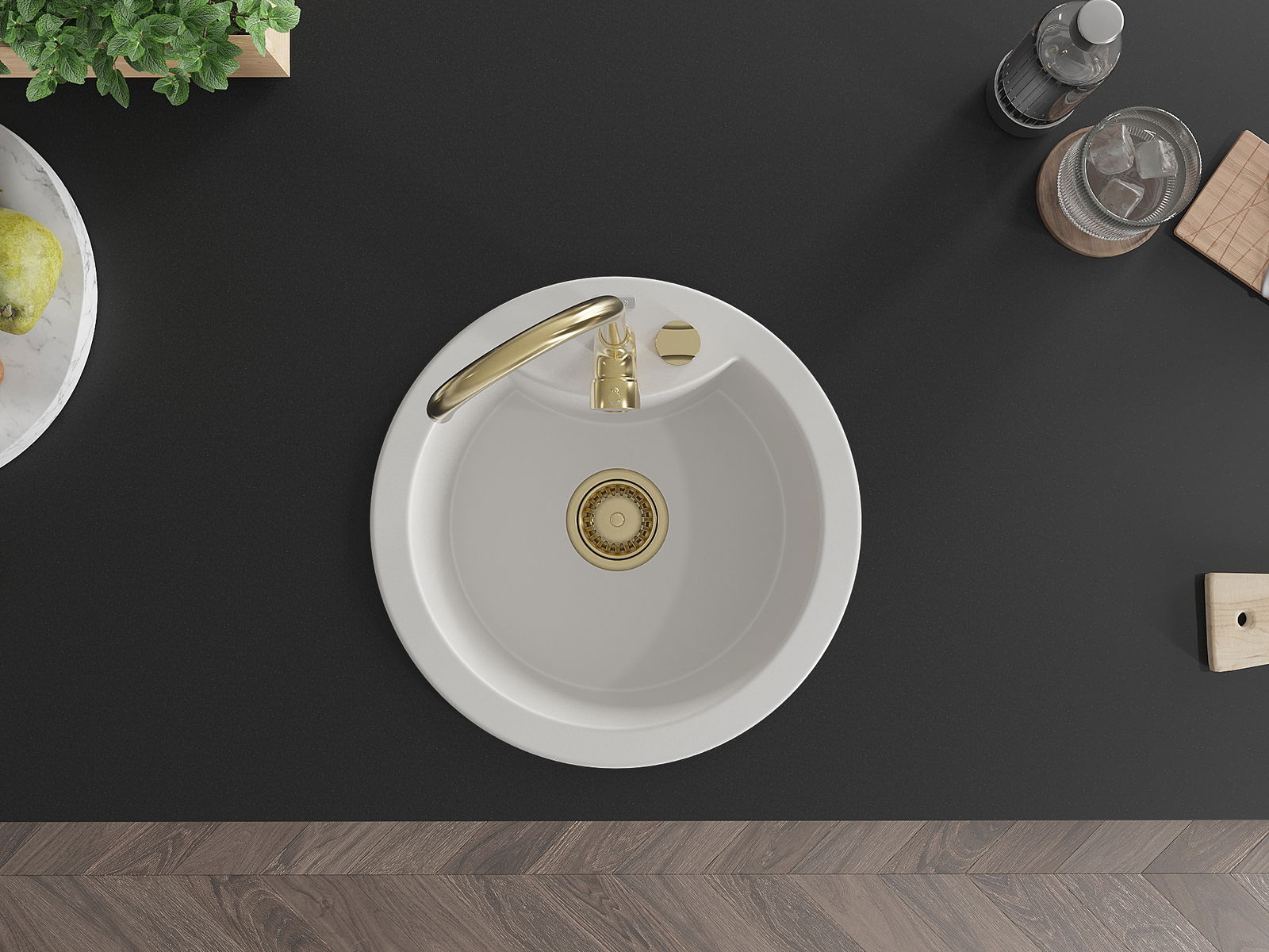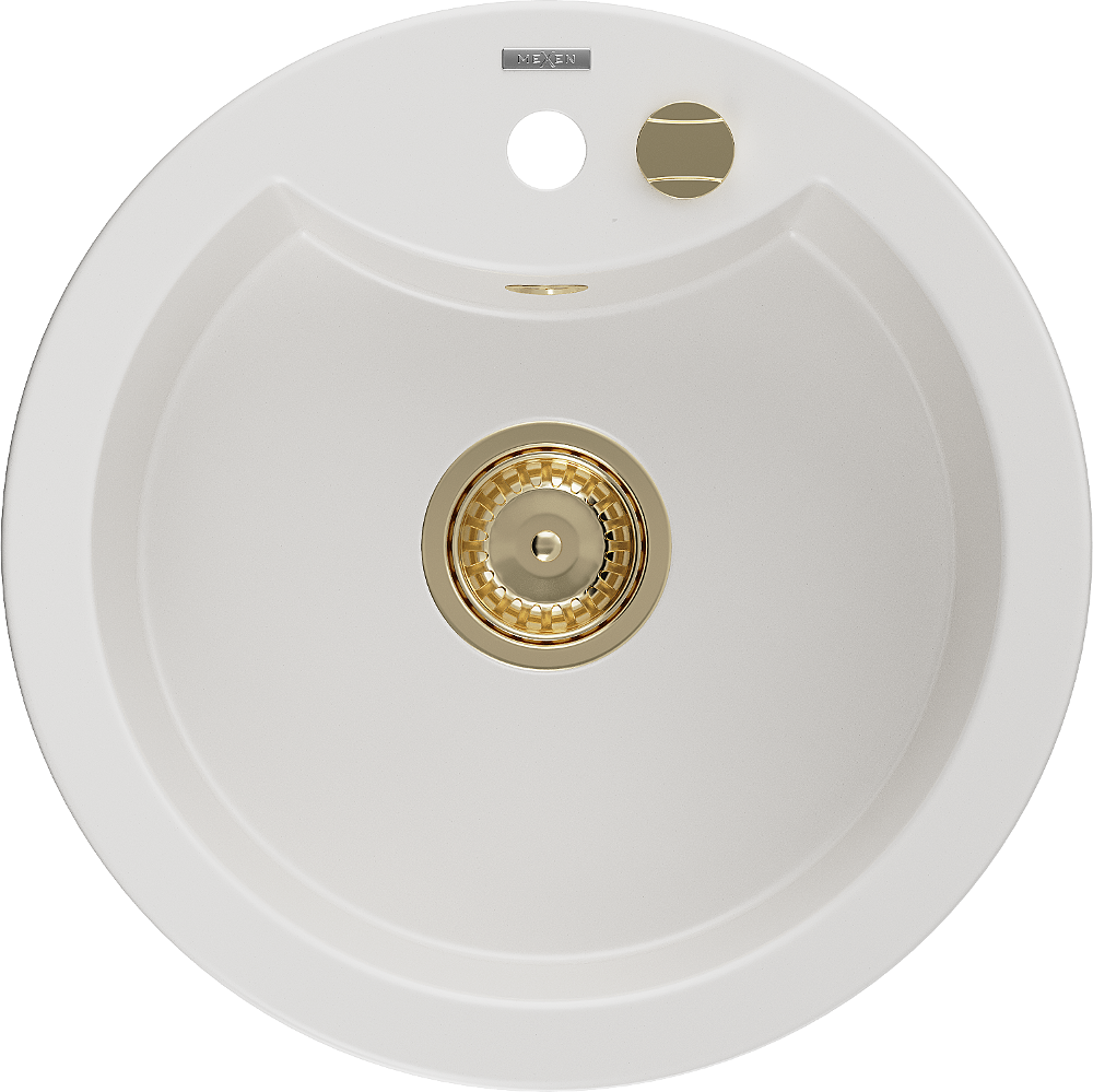 Mexen Diego vienkamerė granito plautuvė 488 x 480 mm, balta, auksinis sifonas - 6512481000-20-G